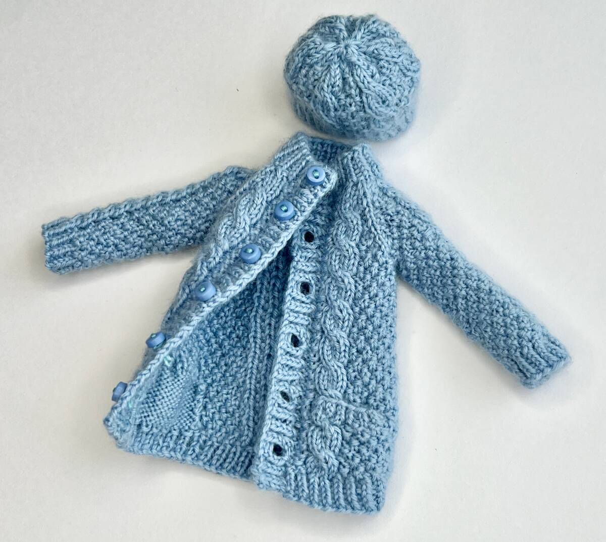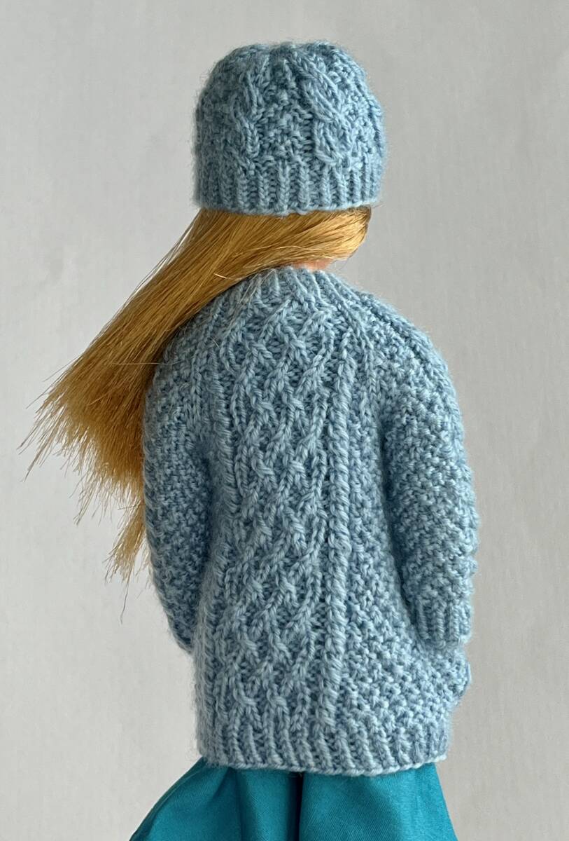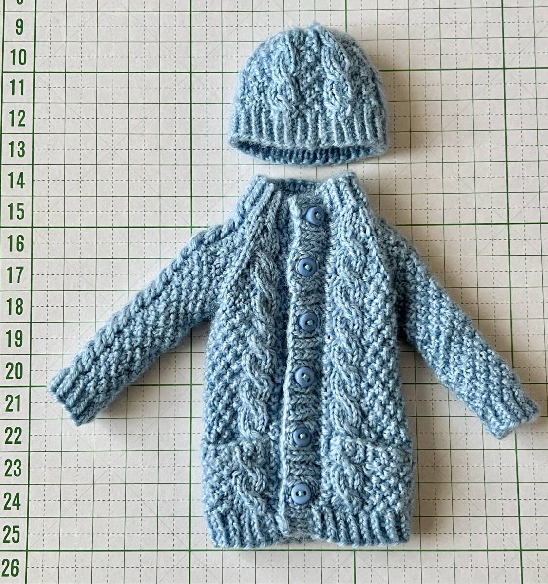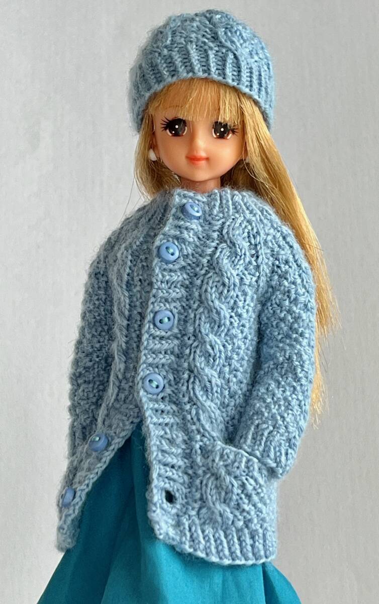 ■送料込み●ハンドメイド●1/6ドール(ジェニーサイズ)●ケーブル編み&かのこ編みポケット付きロングカーディガン&ニット帽子●水色