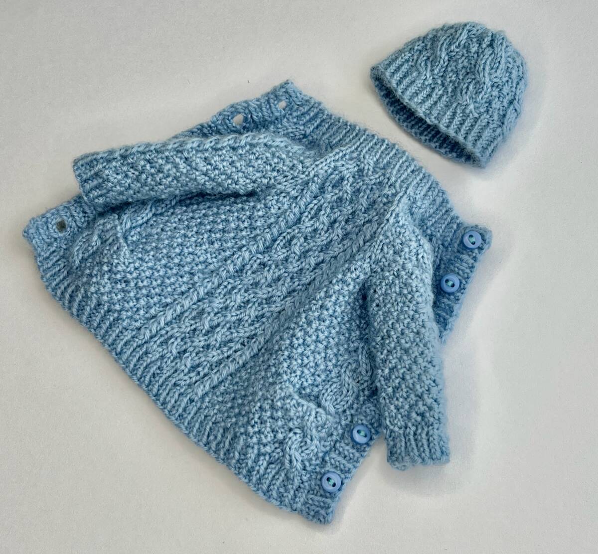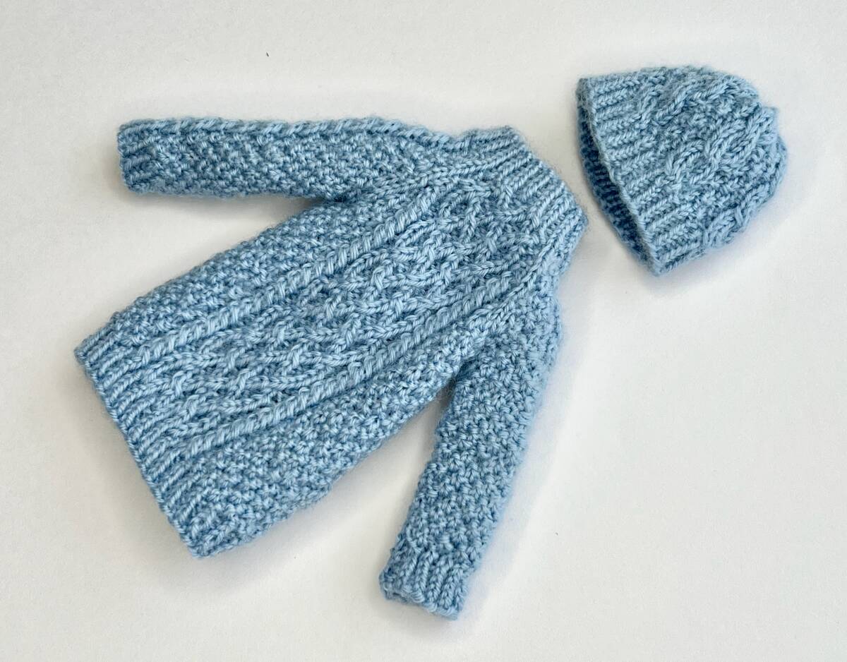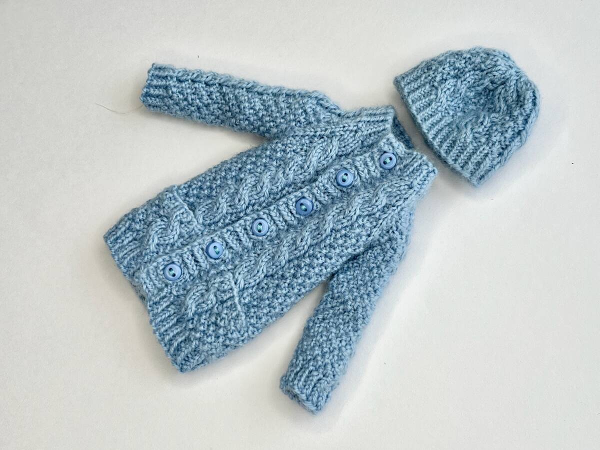 ■送料込み●ハンドメイド●1/6ドール(ジェニーサイズ)●ケーブル編み&かのこ編みポケット付きロングカーディガン&ニット帽子●水色