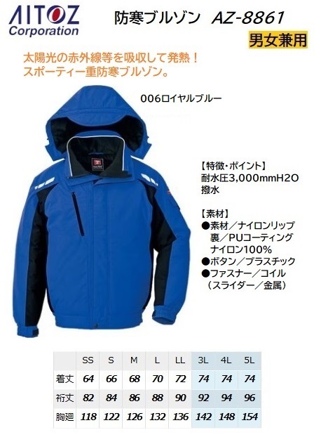 【超特価】◆アイトス [秋冬] 防寒ブルゾン AZ-8861【006ロイヤルブルー・LLサイズ】定価21010円・耐水圧3,000mmH2O・撥水の品、即決2980円