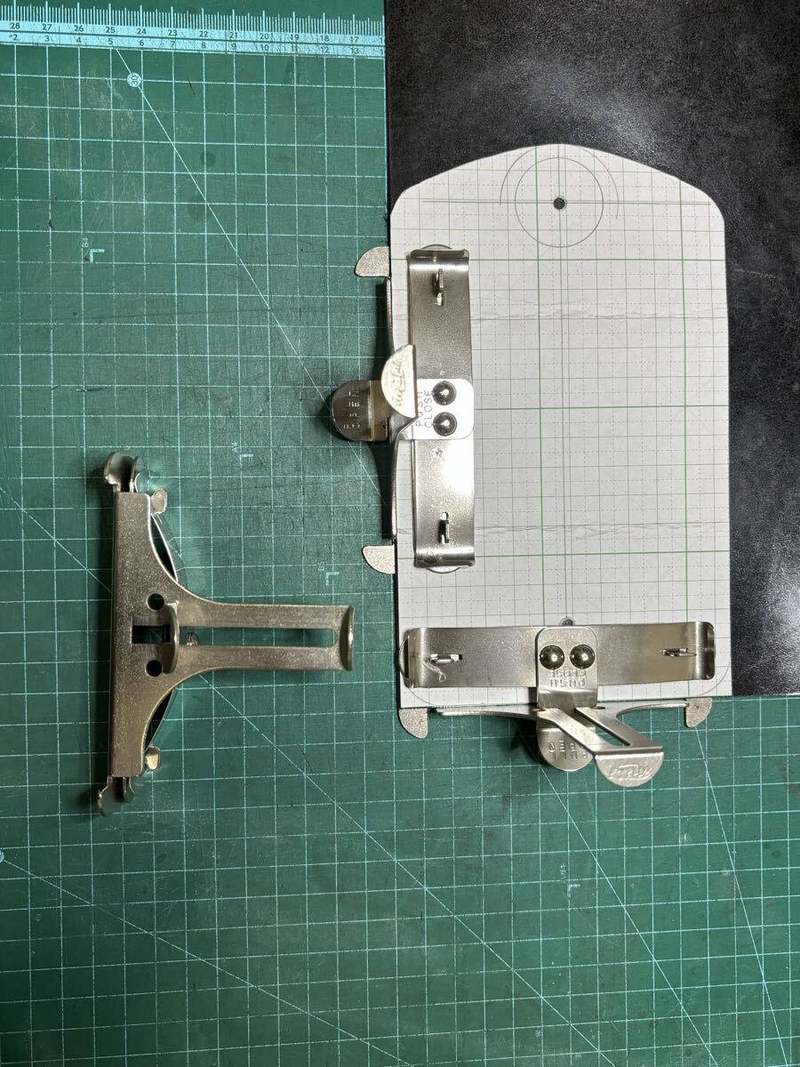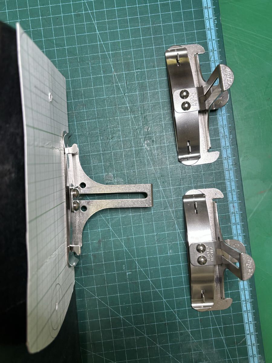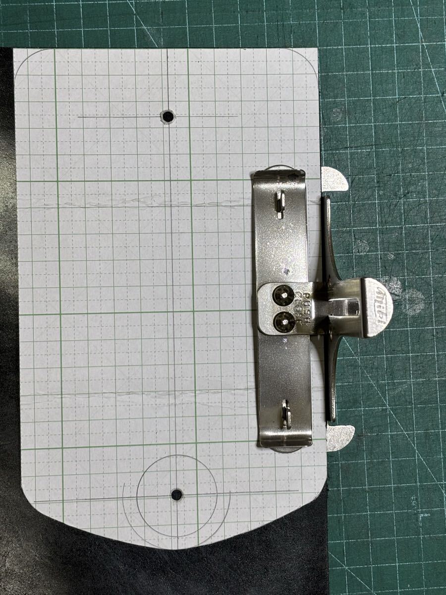 中央の山型になっています所を押さえるだけで型紙と革を簡単に素早く固定する事が出来ます、ワンプッシュです、物を重ねて固定するには必要不可欠な道具だと思います。