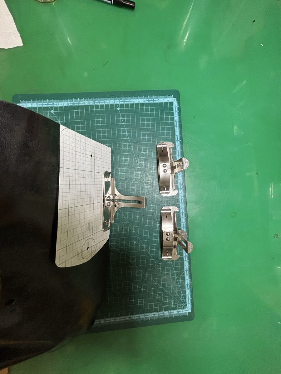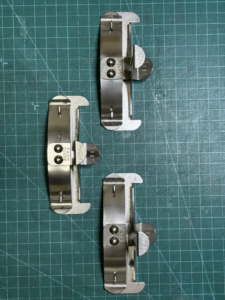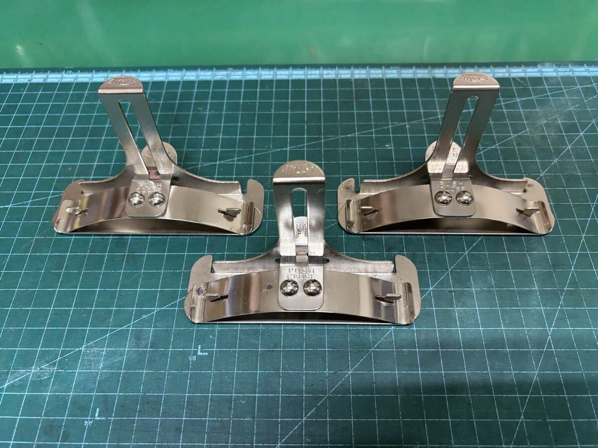中央の山型になっています所を押さえるだけで型紙と革を簡単に素早く固定する事が出来ます、ワンプッシュです、物を重ねて固定するには必要不可欠な道具だと思います。