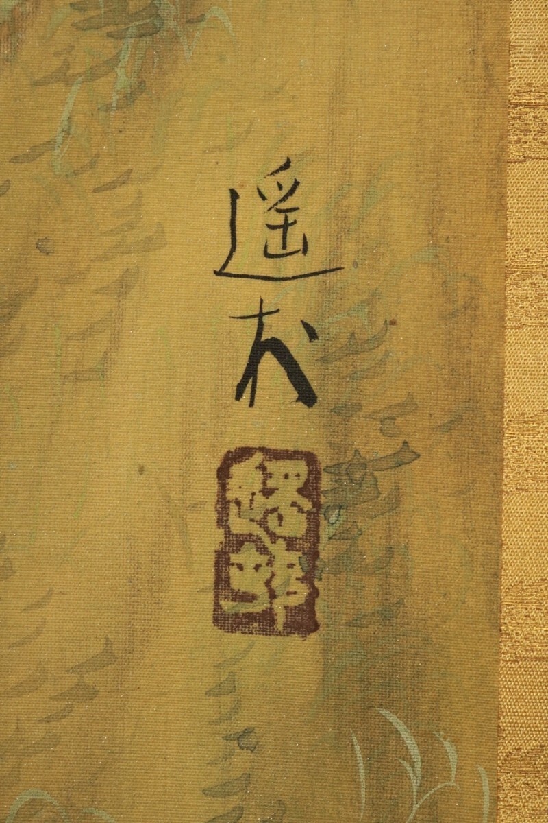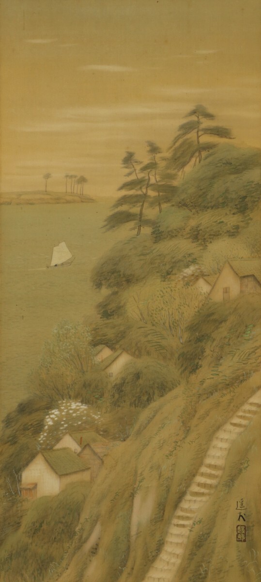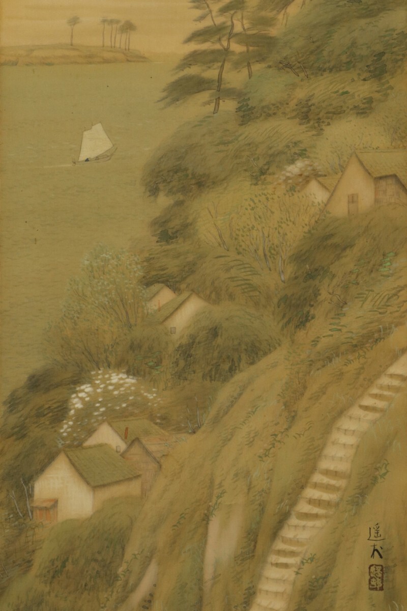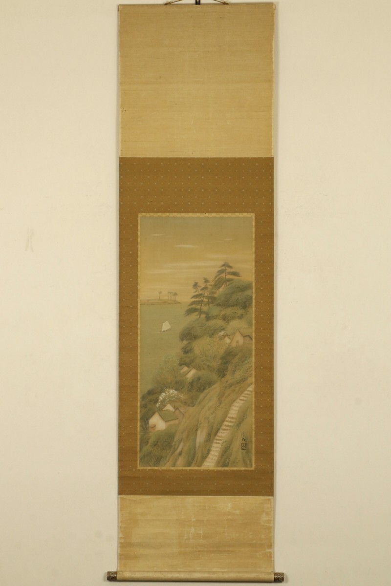 総丈サイズ…横 48.5 × 縦 179.5 cm 絹本着色・箱入 若年作 状態…表具少シミ・少オレ・微少傷ミ 本紙微少シミ 【印刷ではありません】 【真作】 池田遙邨 日本画家。岡山県生。名は昇一。京都絵専卒。初め松原三五郎の天彩画塾で洋画を学ぶが、のち日本画に転向、竹内栖鳳の竹杖会に入門する。冨田渓仙の影響を受けた鳥瞰図法による明るい色彩の風景画で独自の画境を開く。上村松篁らと水明会を、浜田観らと葱青社を結成、また画塾青塔社を主催し後進の育成にあたる。新文展・日展審査員を歴任。日展顧問・芸術院会員。文化功労者。文化勲章受章。昭和63年(1988)歿、93歳。 |