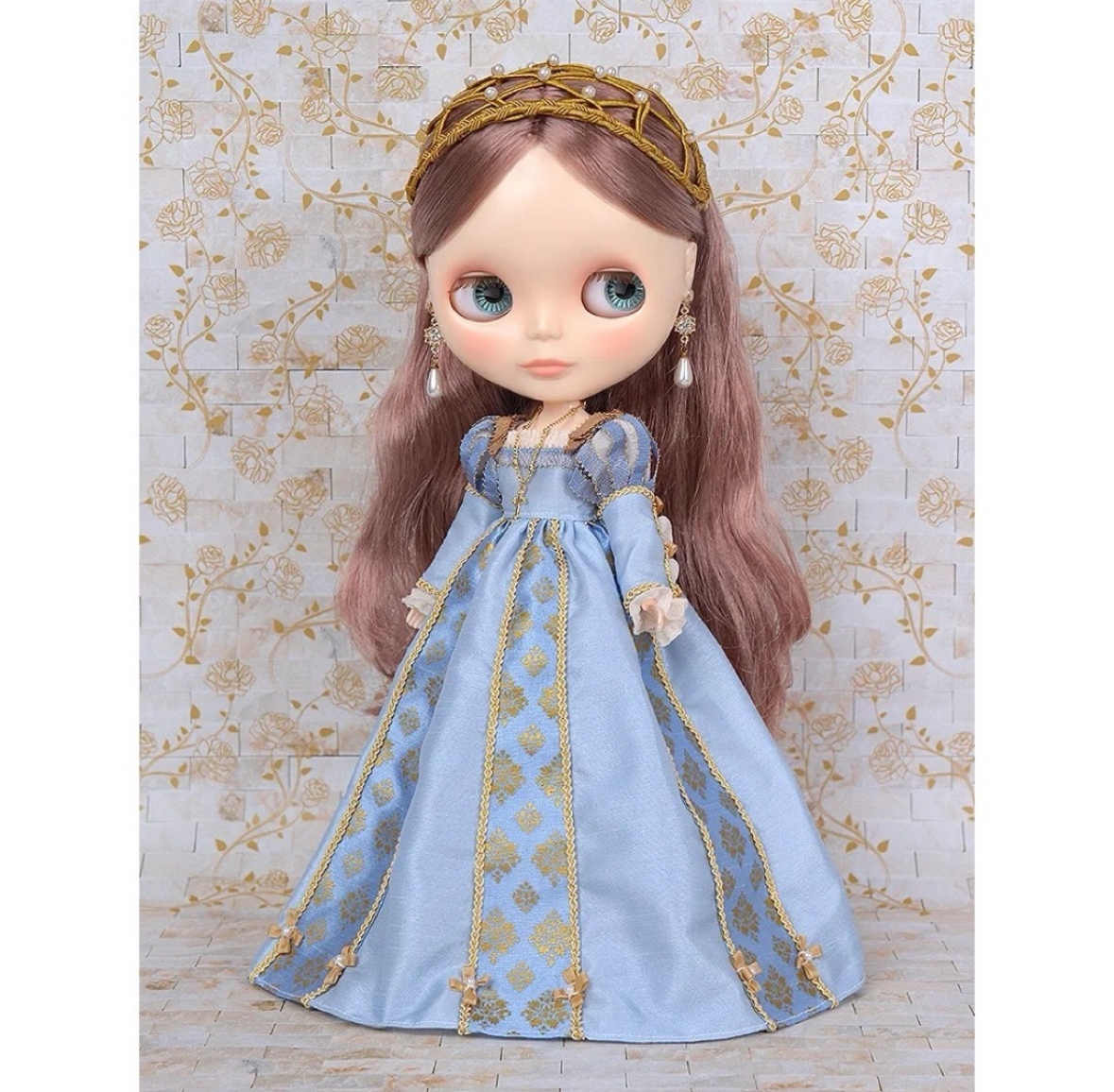 【セット内容】ドール、ドレス(ブルー、ホワイトの2着)、ヘッドドレス、カチューシャ、ピアス、ネックレス、ペチコート、ドロワーズ、シューズ、スタンド