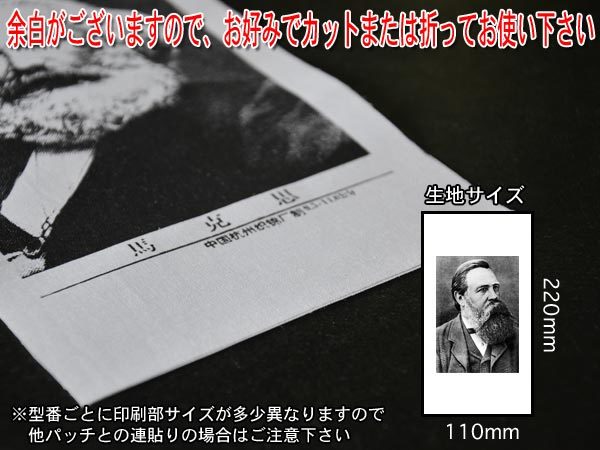 ・商品名:パッチ - マルクス(白地・黒印刷) ・型番:A026 ・サイズ:生地:長さ220mm・幅110mm/印刷部:長さ140mm・幅90mm ※多少の誤差はご了承下さい ・カラー:白生地・黒印刷 ・材質:コットン100% 【注意事項】 ※版印刷ですので、多少の色むらやスレのある場合がございます ※のり付けではございませんので、ミシンか手縫いで固定してください ※返品をお受けすることは出来ませんので、上記注意事項を十分ご理解のうえお申し込み下さい |