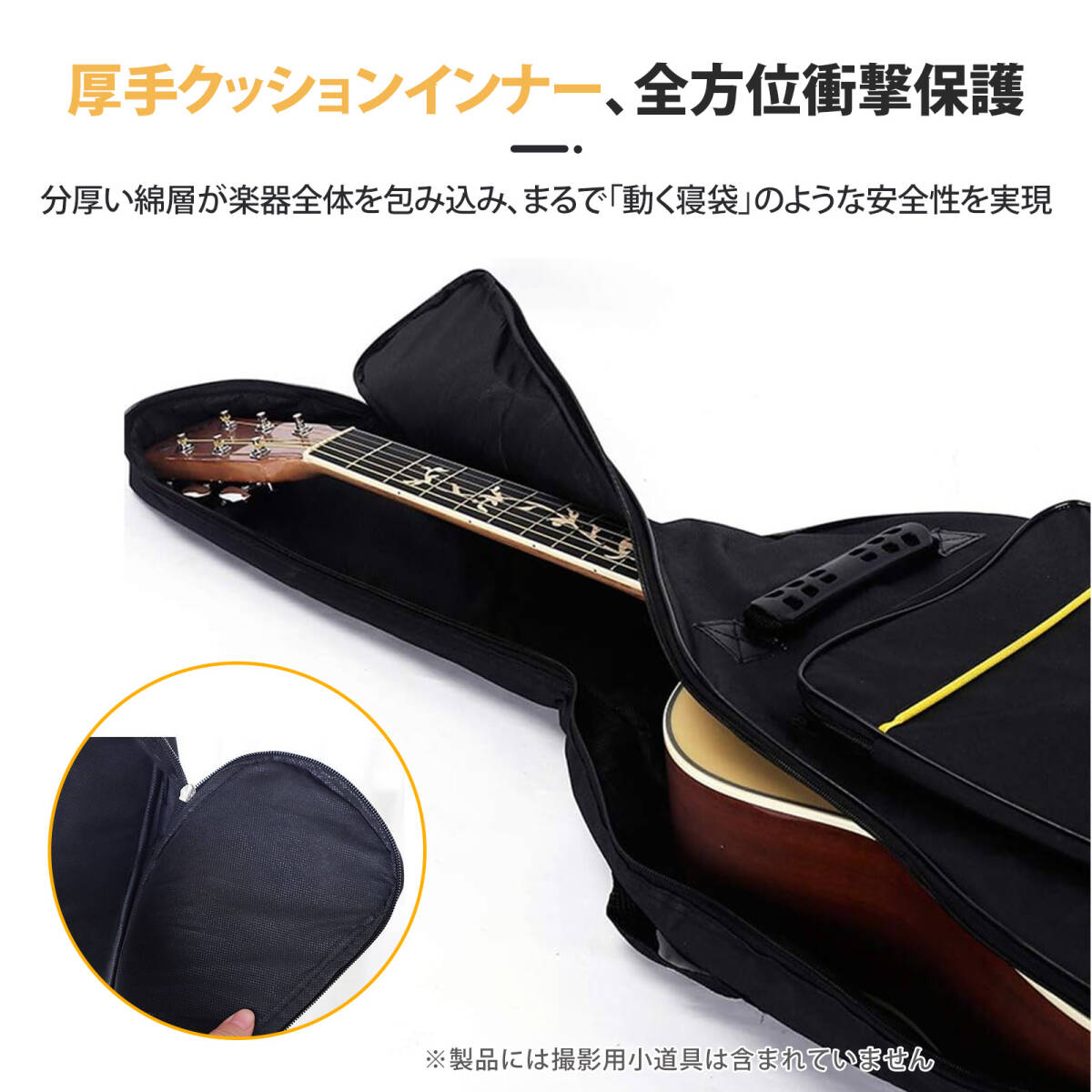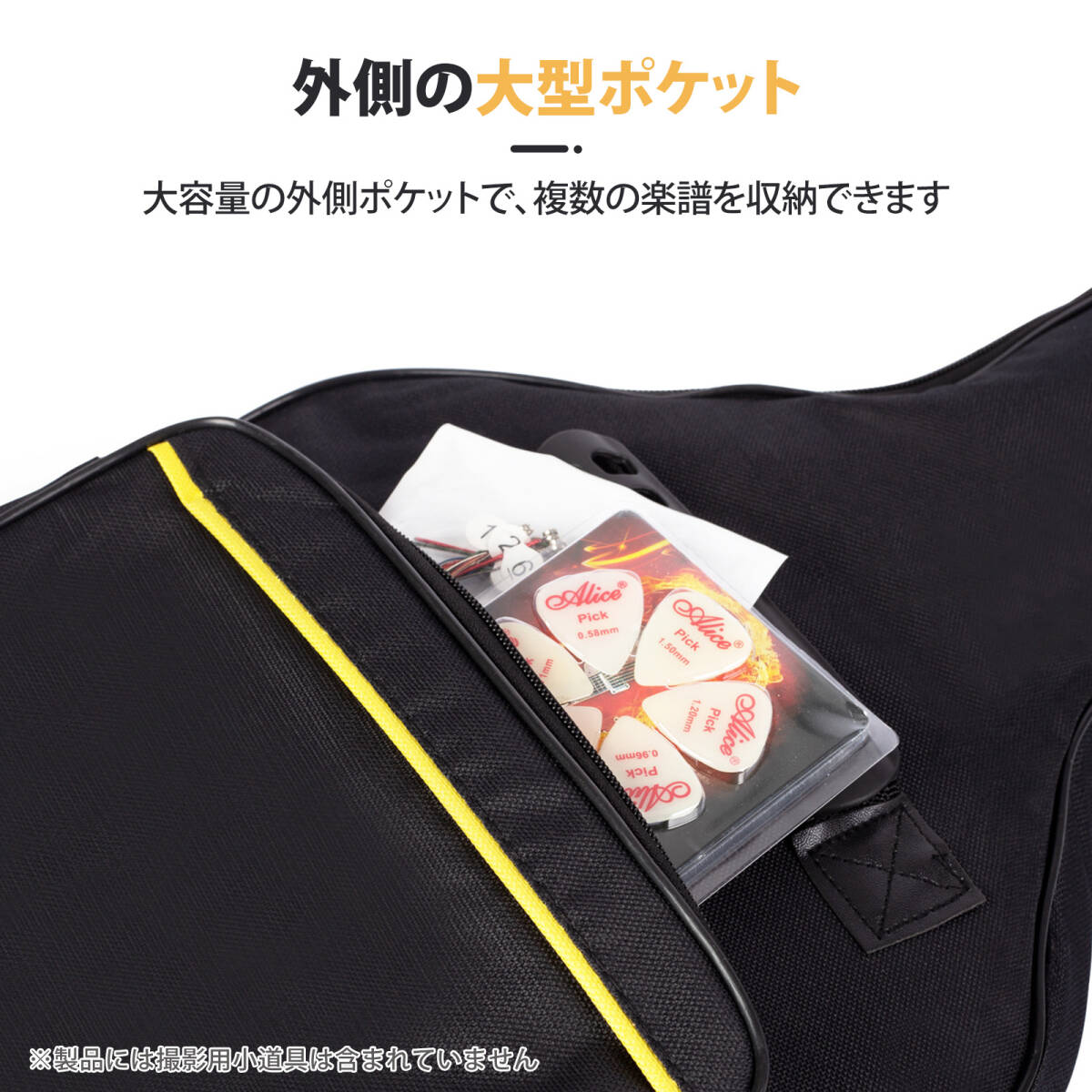 | この商品について | 【防水オックスフォード素材で耐久性抜群】:表面には防水加工を施した高品質オックスフォード布を採用。突然の雨や汚れにも強く、長期間の使用でも型崩れしにくい設計です。 【5mm厚手クッションでしっかり保護】:内部には5mmの高密度スポンジを使用。外部からの衝撃や圧力を吸収し、ベース本体の傷や破損を防ぎます。ライブや移動中も安心です。 【大容量ポケットで収納力アップ】:外側の大ポケットには、楽譜やチューナー、ケーブルなどのアクセサリーをまとめて収納可能。レッスンやリハーサルにも便利です。 【快適な持ち運び設計】:人間工学に基づいた減圧ショルダーストラップを採用。背負っても肩や背中への負担を軽減し、長時間の移動も快適。さらにソフトラバー製ハンドルで手持ちもラクラク。 【ダブルジッパー仕様でスムーズ開閉】:丈夫で滑らかな双方向ファスナーを採用。開閉時の引っかかりがなく、ストレスフリーな使用感を実現しました。 |