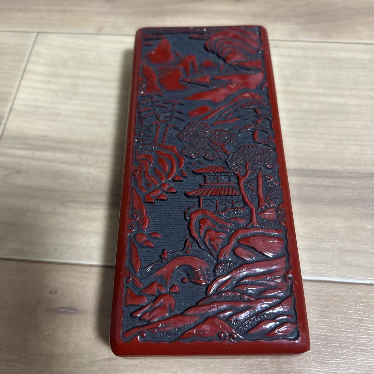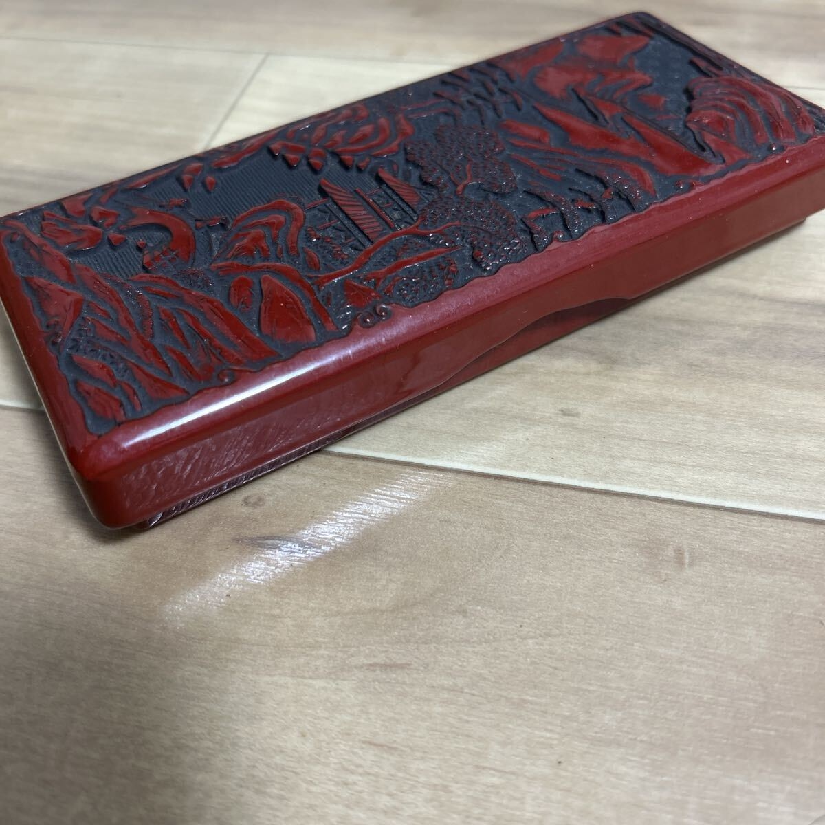 - デザイン: 浮世絵風の彫刻が施された赤い漆塗りの文箱