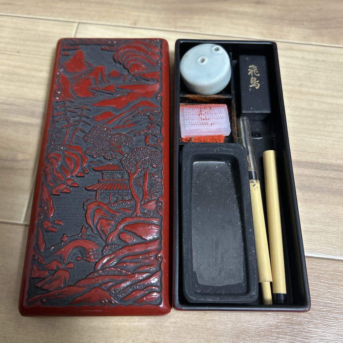 浮世絵風の彫刻が施された赤い漆塗りの文箱、文房具用具一式付き。