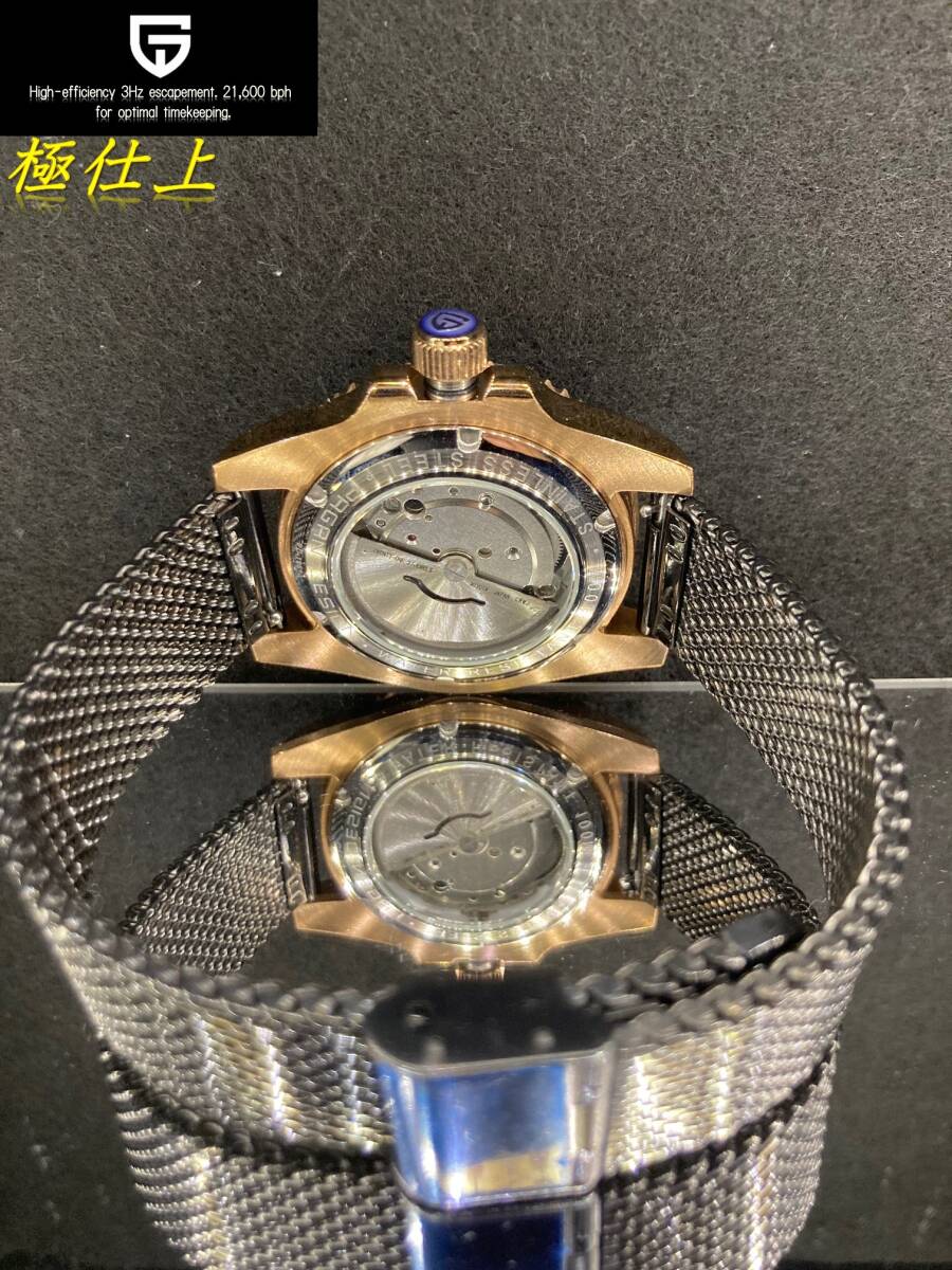 ■とても迫力ある時計です。ローズゴールドとブラック布風ブレスで蒸れずらくで引き締まった印象です。ローズゴールドを傷つけないよう研磨は最小限としています。(時計本体側)