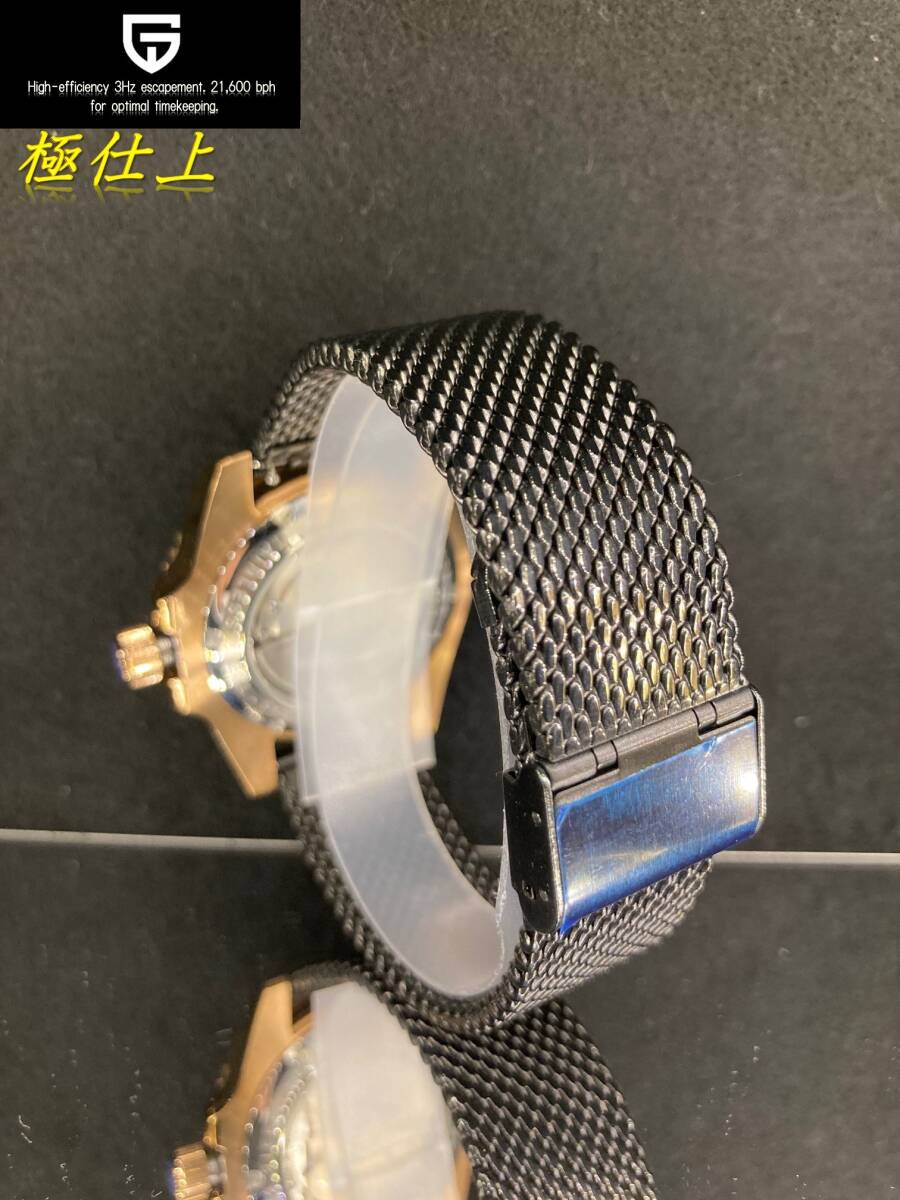 ■とても迫力ある時計です。ローズゴールドとブラック布風ブレスで蒸れずらくで引き締まった印象です。ローズゴールドを傷つけないよう研磨は最小限としています。(時計本体側)