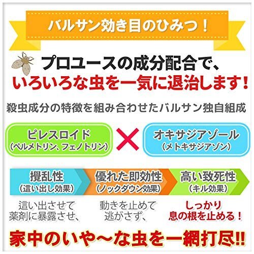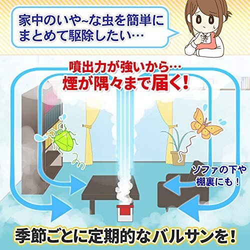 ブランド:バルサン●殺虫くん煙剤のパイオニアとして70年。信頼と実績のバルサンブランドから、さまざまな不快害虫に効く「くん煙剤」が出ました。●バルサン独自の強力な噴射力で、お部屋のスミズミまで煙が届き、隠れた不快害虫によく効きます。●お部屋に発生・侵入する、幅広い種類の不快害虫を、効きめのバルサンが駆除します。●バルサンの高い効き目の秘密は・・・「這い出させる撹乱効果」、「動きを止める即効性」、「しっかり息の...商品サイズ(幅×奥行×高さ):7.8×7.8×10.1cm