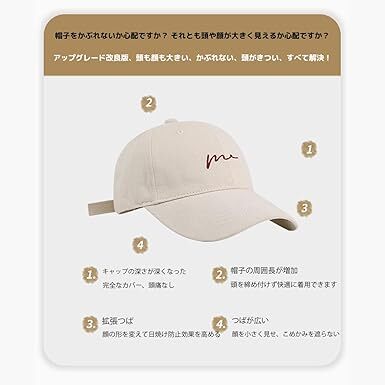 ①:フェイスラインを自然にカバーし、小顔効果を演出。 深めの設計で頭全体を包み込み、安心感のあるフィット感を実現。シンプルながらも日系・韓国風のデザインで、誰でもおしゃれに見えるキャップです。フロント部分にはさりげないアルファベット刺繍を施し、洗練された雰囲気をプラスしました。
