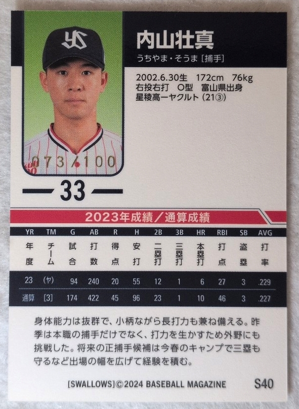 ★100枚限定★ 内山壮真 東京ヤクルトスワローズ 73/100 BBM 2024