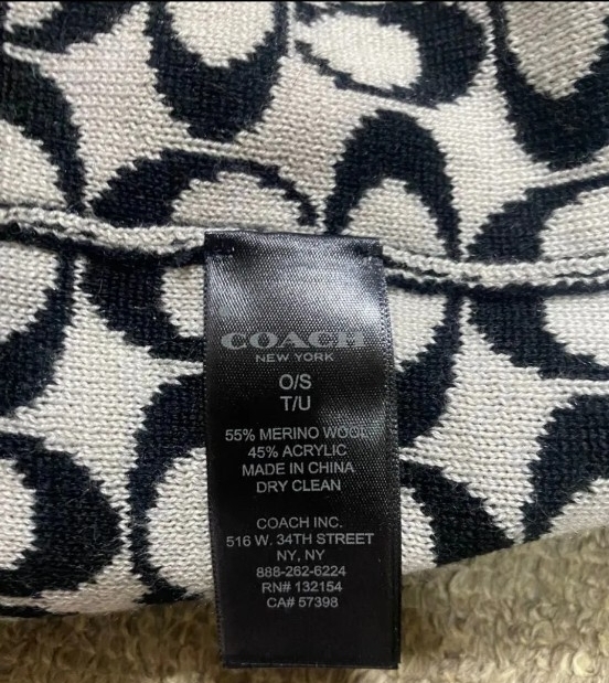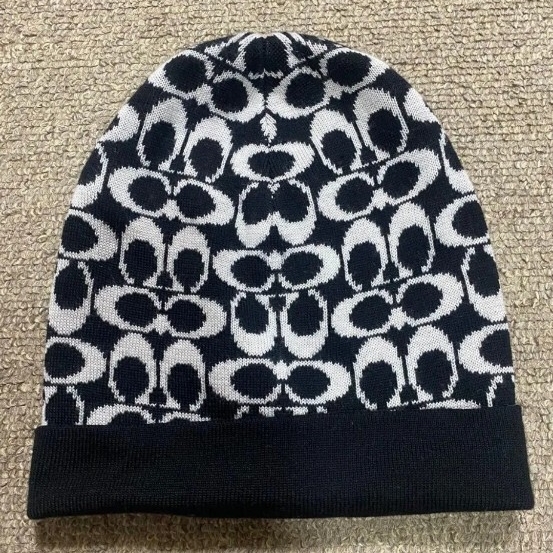 COACHのシグネチャー柄ニット帽です。ブラックとホワイトのモノトーンカラーで、様々なコーディネートに合わせやすいデザインです。