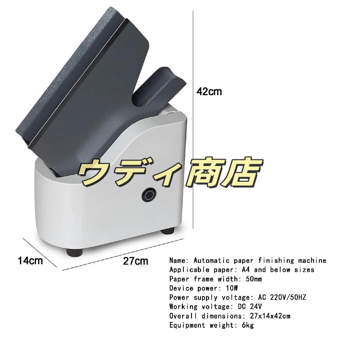 名前: 自動紙仕上げ機 対応用紙:A4以下サイズ 紙枠幅:50mm デバイス電力: 10W 電源電圧:AC220V/50HZ 動作電圧: DC 24V 全体の寸法: 27x14x42cm 装備重量:6kg