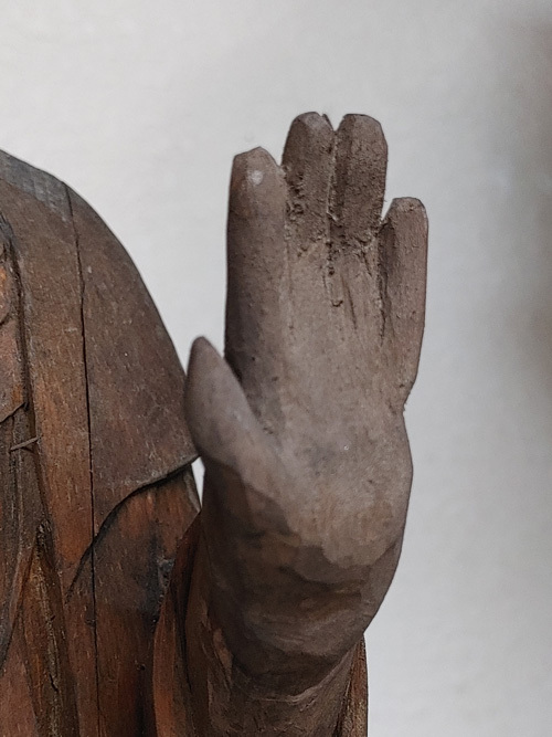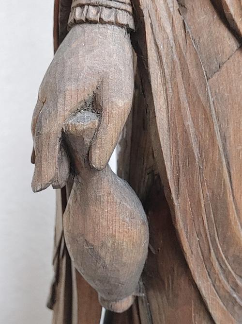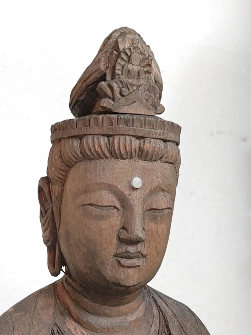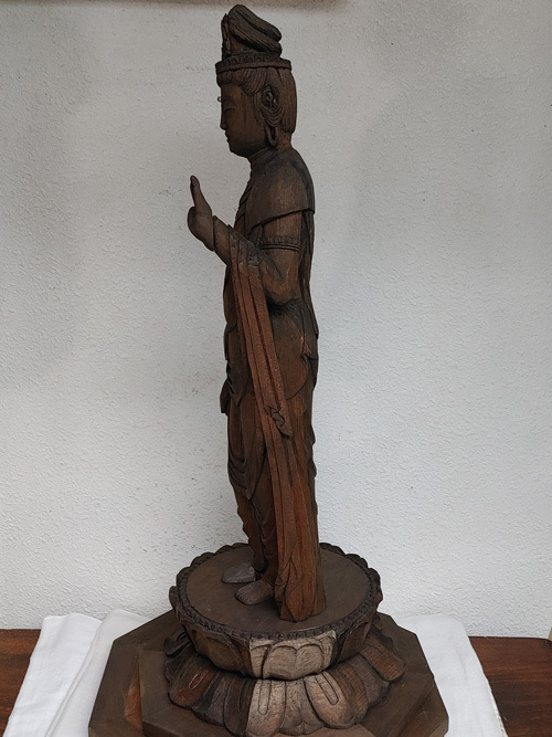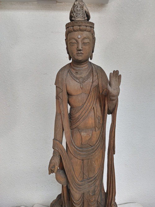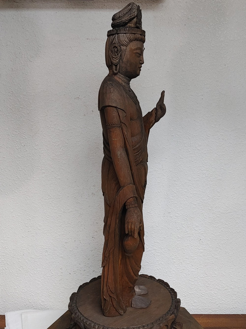 右手に水瓶を持ち顔や頭部や衣文もしっかり彫られており