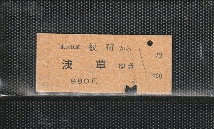 東武鉄道 板荷から浅草 B型 黄地紋 硬券乗車券 下パンチ券