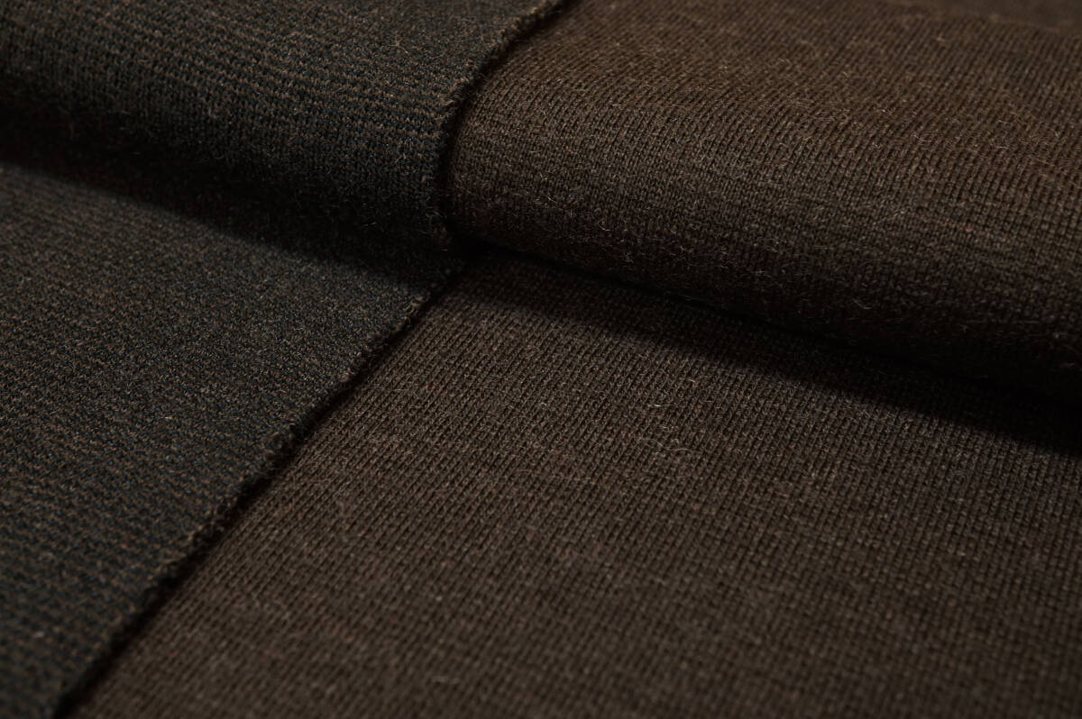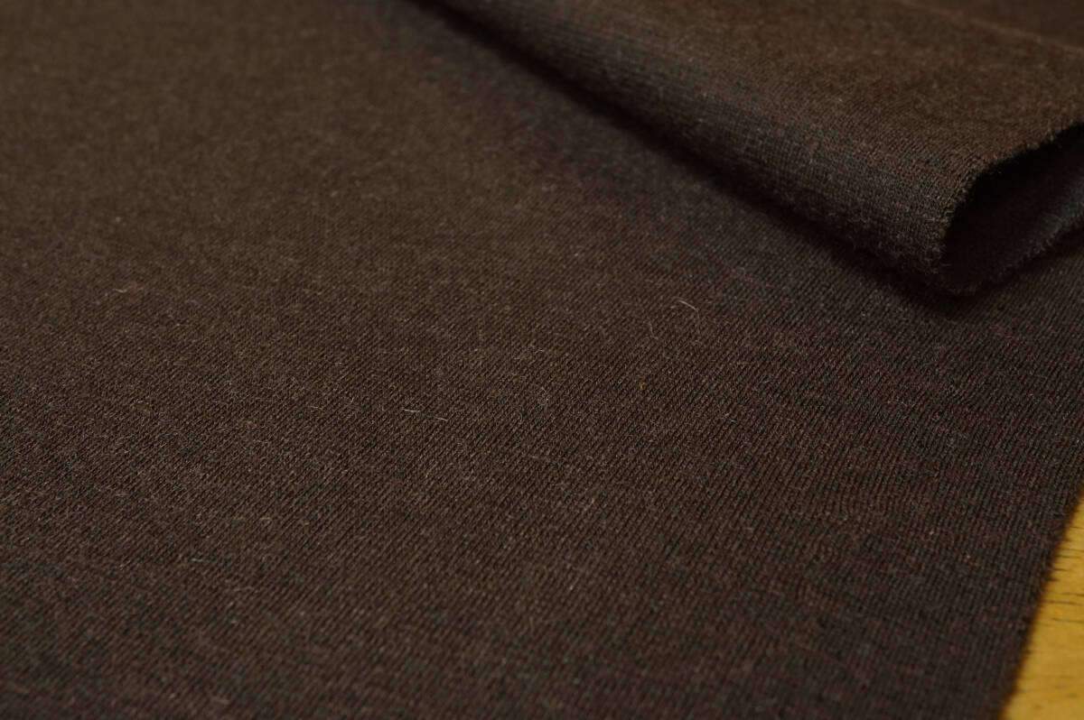 アクリル65% ポリエステル19% ウール16%、厚さは中厚地、巾方向に少しストレッチがあり、柔らかソフトな風合いで、ウール混ですがチクチク感も無く、しっとり暖かみのある肌ざわりでございます。また、表糸に抗ピリングタイプのアクリルウール混紡糸を使用しているため、毛玉が発生しにくくなっております。