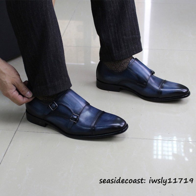 入手困難*ダブルモンクストラップ メンズ 本革 レザーシューズ 職人手作り ビジネスシューズ 最上級牛革 紳士靴 革靴 新品 ブルー 25.5cm