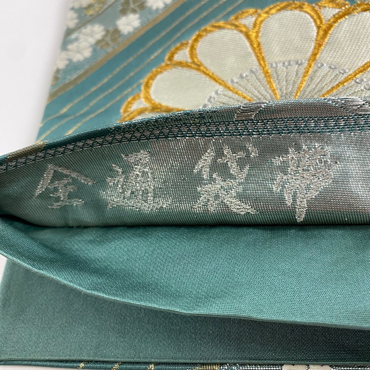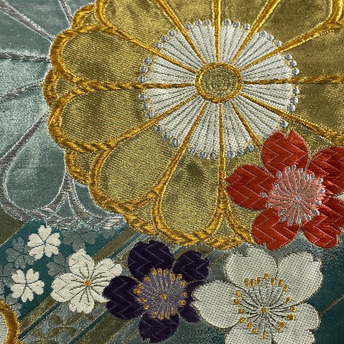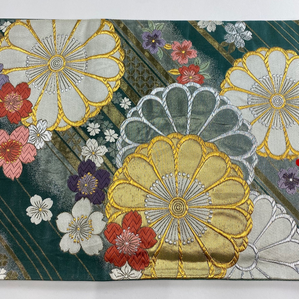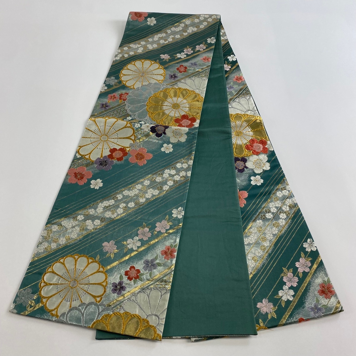 | 袋帯 秀品 菊 桜 金銀糸 箔 灰緑 全通 正絹 【中古】 |