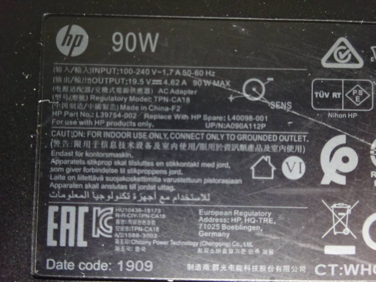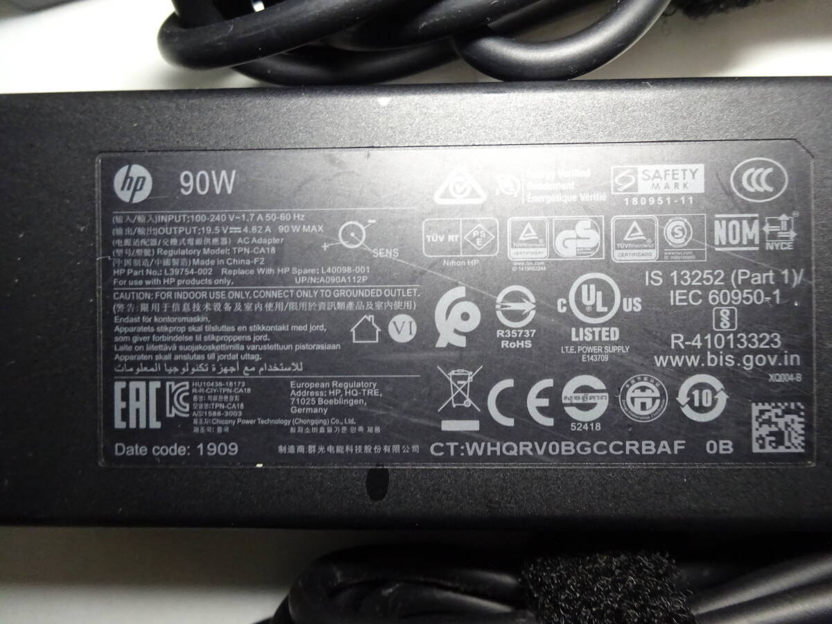 HP 90.0W MODEL:TPN-CA18 OUTPUT:19.5V-4.62A INPUT:100-240V~1.7A 50-60Hz 付属品:ACコード 3個