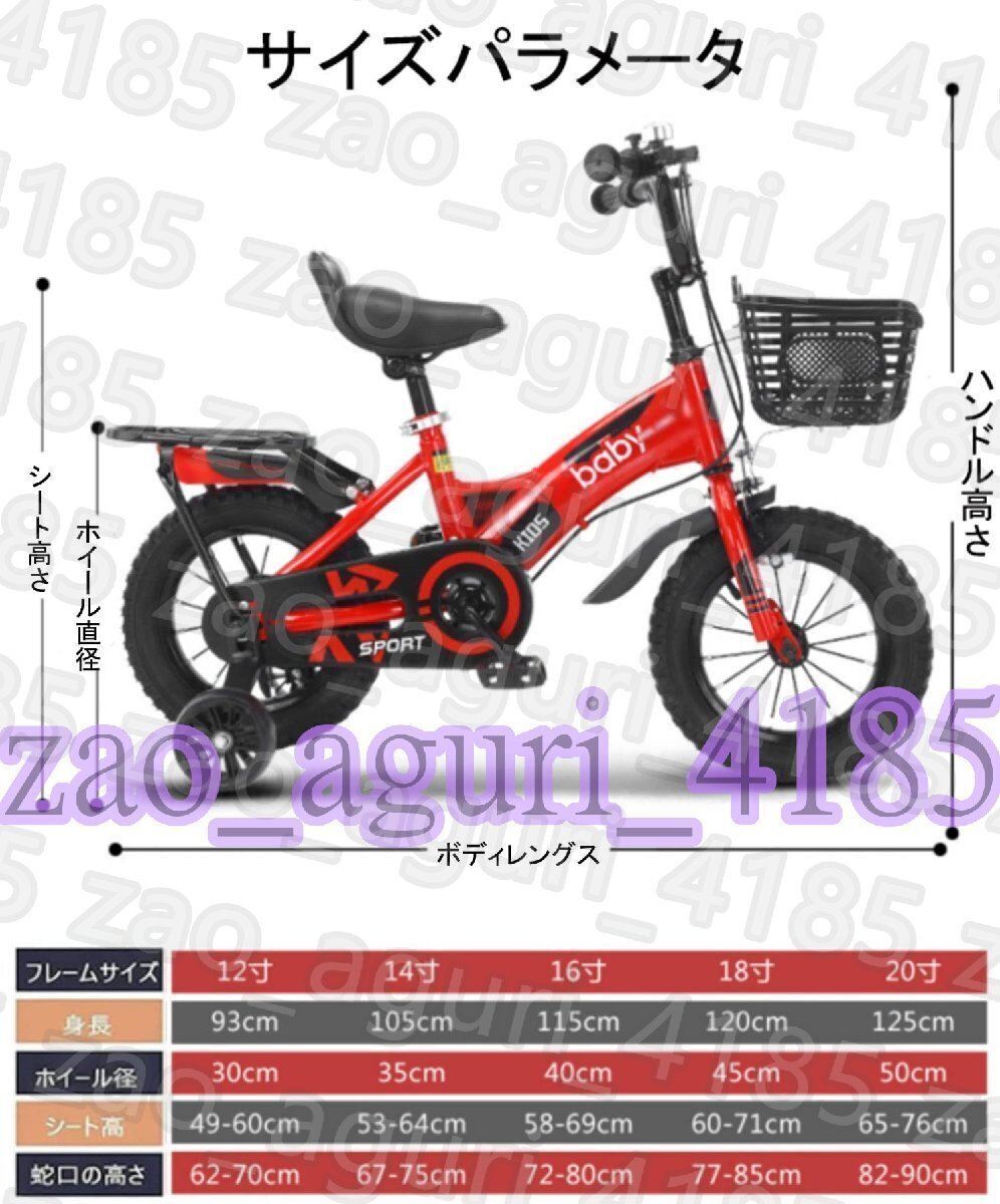 ?2?12歳幼児用バイク:(12 ":2-5歳/ 85-105高さ)(14 ":3-7歳/ 95-115高さ)(16 ":5-8歳/105-135高さ)(18 ":6-10歳/ 115-150高さ)(20 ":8-12歳/ 125-160高さ)シートの高さ調節可能10CM。公園に乗ったり、近くの歩道に乗ったりするのに最適です。 キッズバイクはあなたと一緒に子供を育てます。