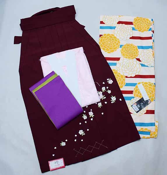 項目 | 二尺袖着物袴フルセット ・二尺袖着物 ・二尺袖長襦袢(半襟付き) ・袴 ・袴下帯(浴衣帯にも使用できます。) |