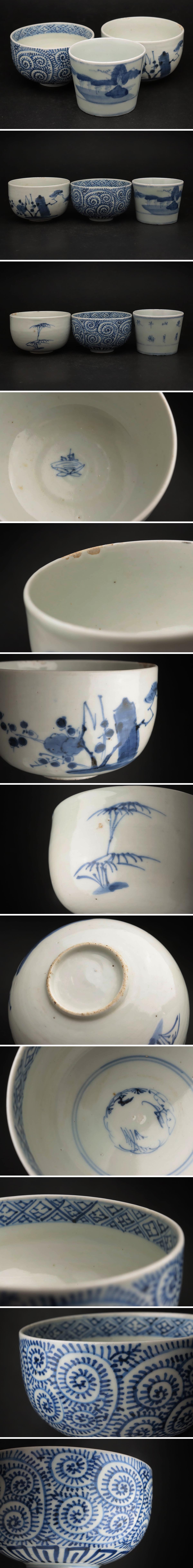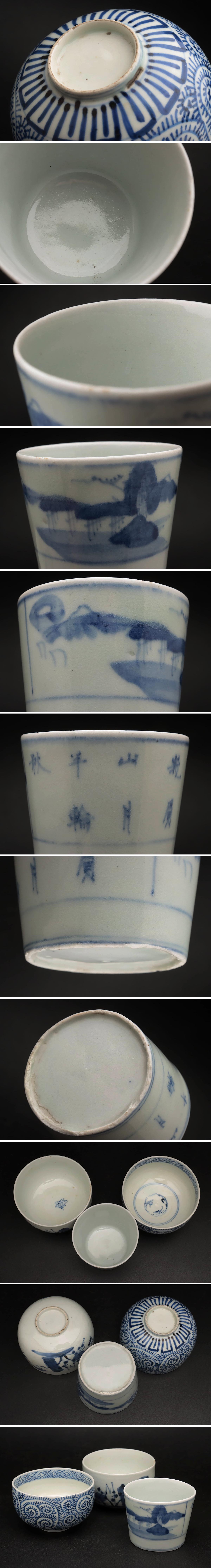 | ◆ 時代古陶 初期 他 伊万里 染付茶碗/猪口 三点組・初期伊万里松竹梅紋杯/伊万里蛸唐草文煎茶碗/伊万里山水漢詩文蕎麦猪口 ◆