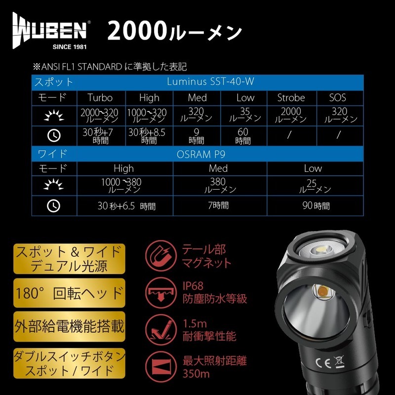 ■ 明るさ最大:スポット…「Luminus SST-40-W」2000ルーメン、ワイド…「OSRAM P9」1000ルーメン