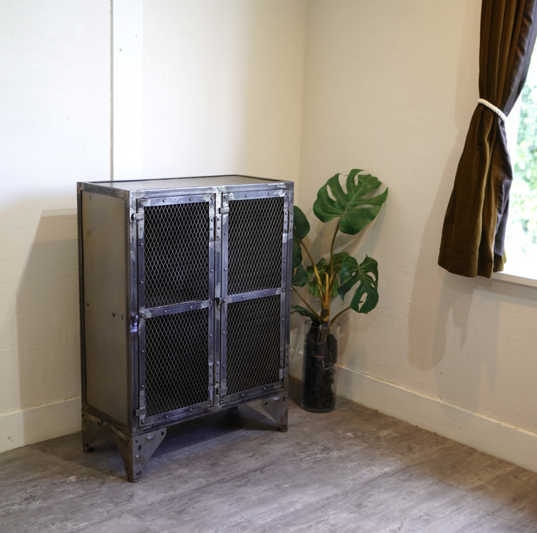 ビンテージ加工を施した、何年も使い込んだような鉄の風合いがカッコいいキャビネットです。コンパクトサイズなので、ちょっとしたスペースにも置けて使いやすいサイズ感。インダストリアルなインテリアがお好きな方におすすめです。