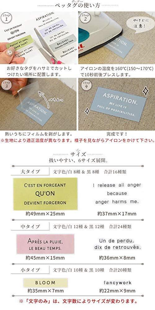 使用方法 1.お好きなタグをハサミでカットし、つけたい場所に配置します。 2.アイロンの温度を160度(150~170度)で10秒前後プレスします。 3.熱いうちにフィルムを剥がします。 4.完成です。 ※火傷などには十分注意しておこなってください。 ※生地により適正温度がことなります。様子を見ながらアイロンをおかけ下さい。 ※説明書は付属しません。使用方法は商品ページ内でご確認下さい。