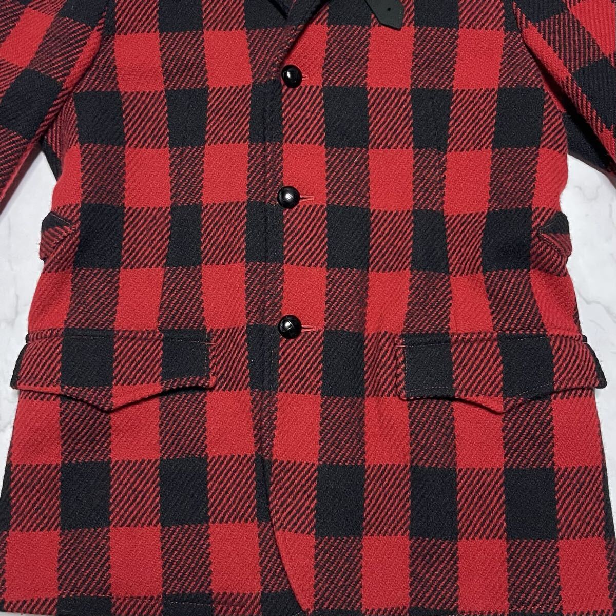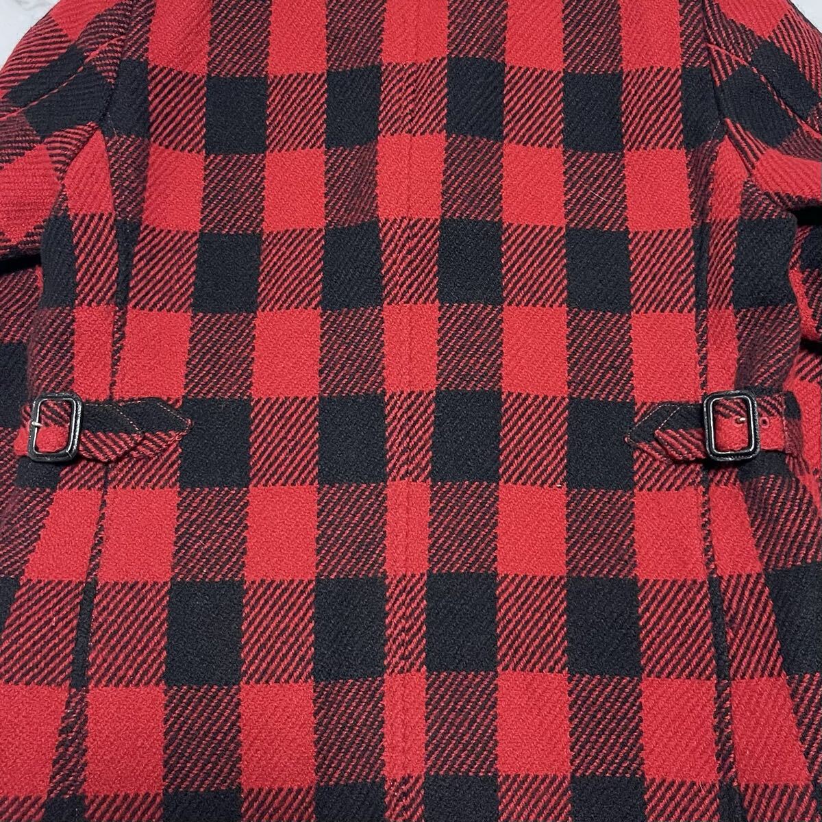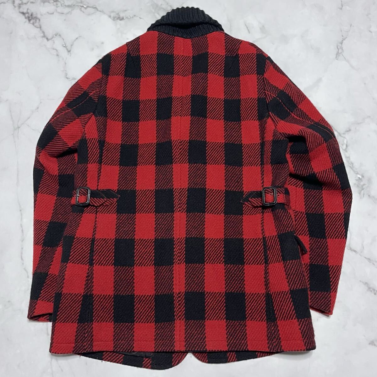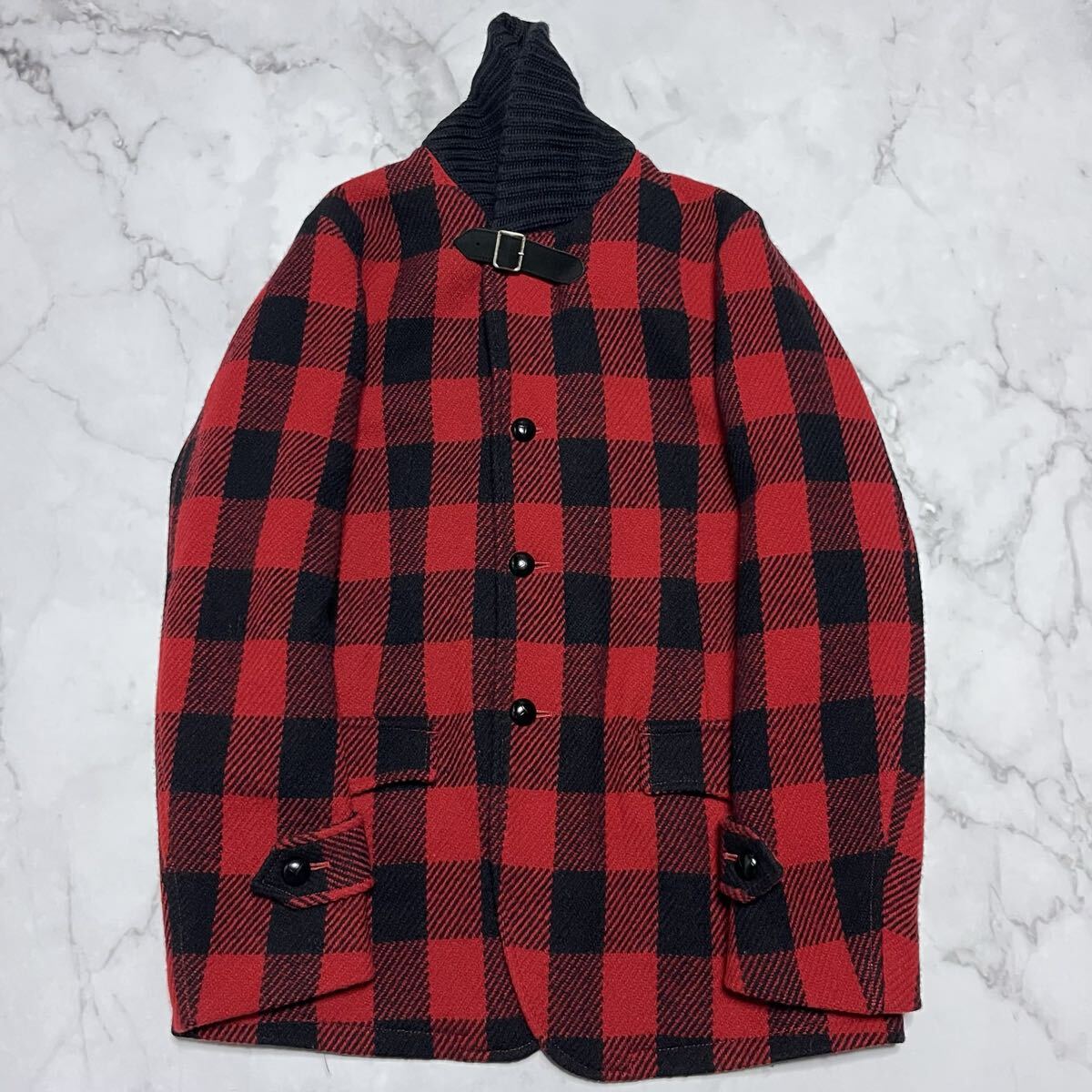 バッファローチェック柄が目を惹くデザインで、襟元には厚手のリブ編みショールカラーを採用し、首元の防寒性をアップ。