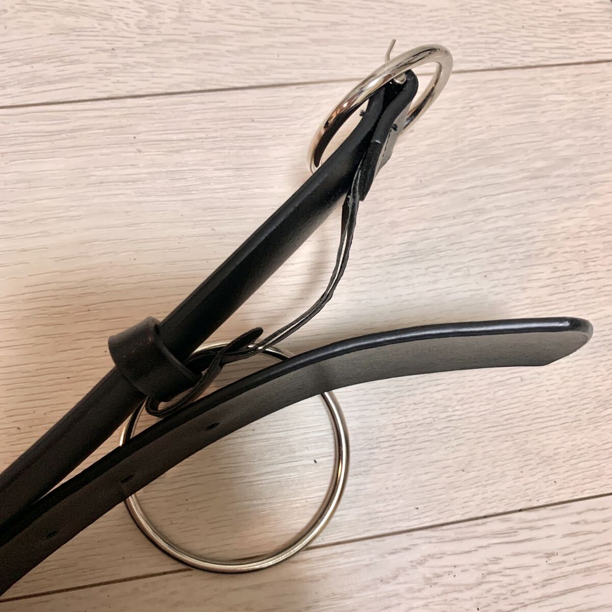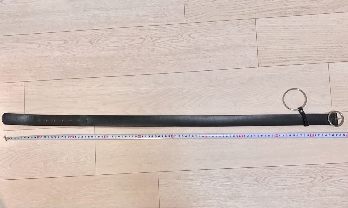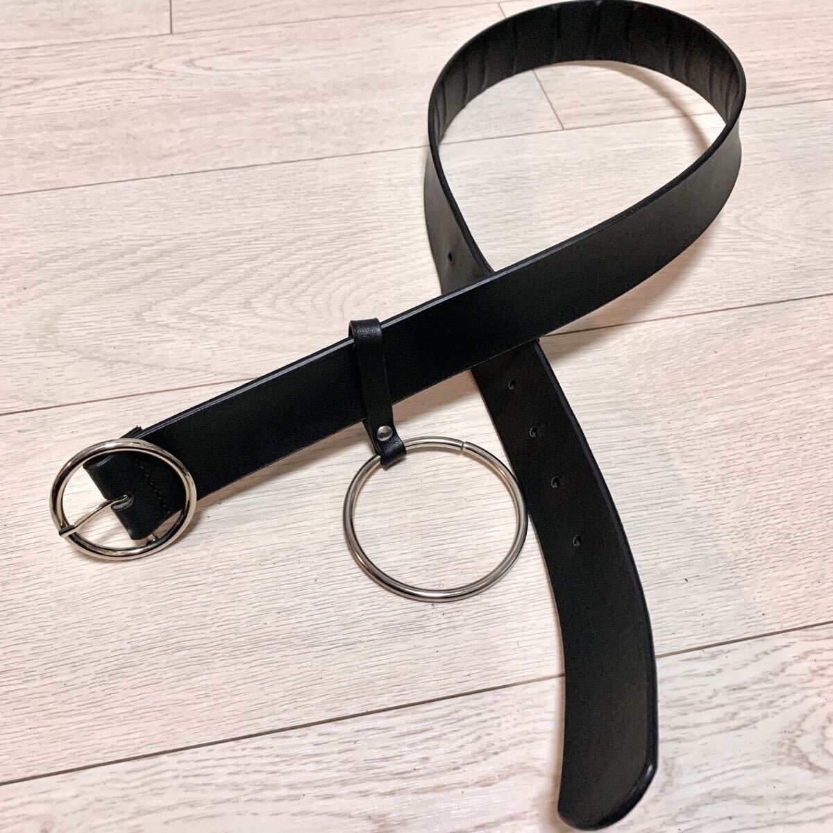 リング付きのブラックレザーベルト、調整可能でスタイリッシュ。