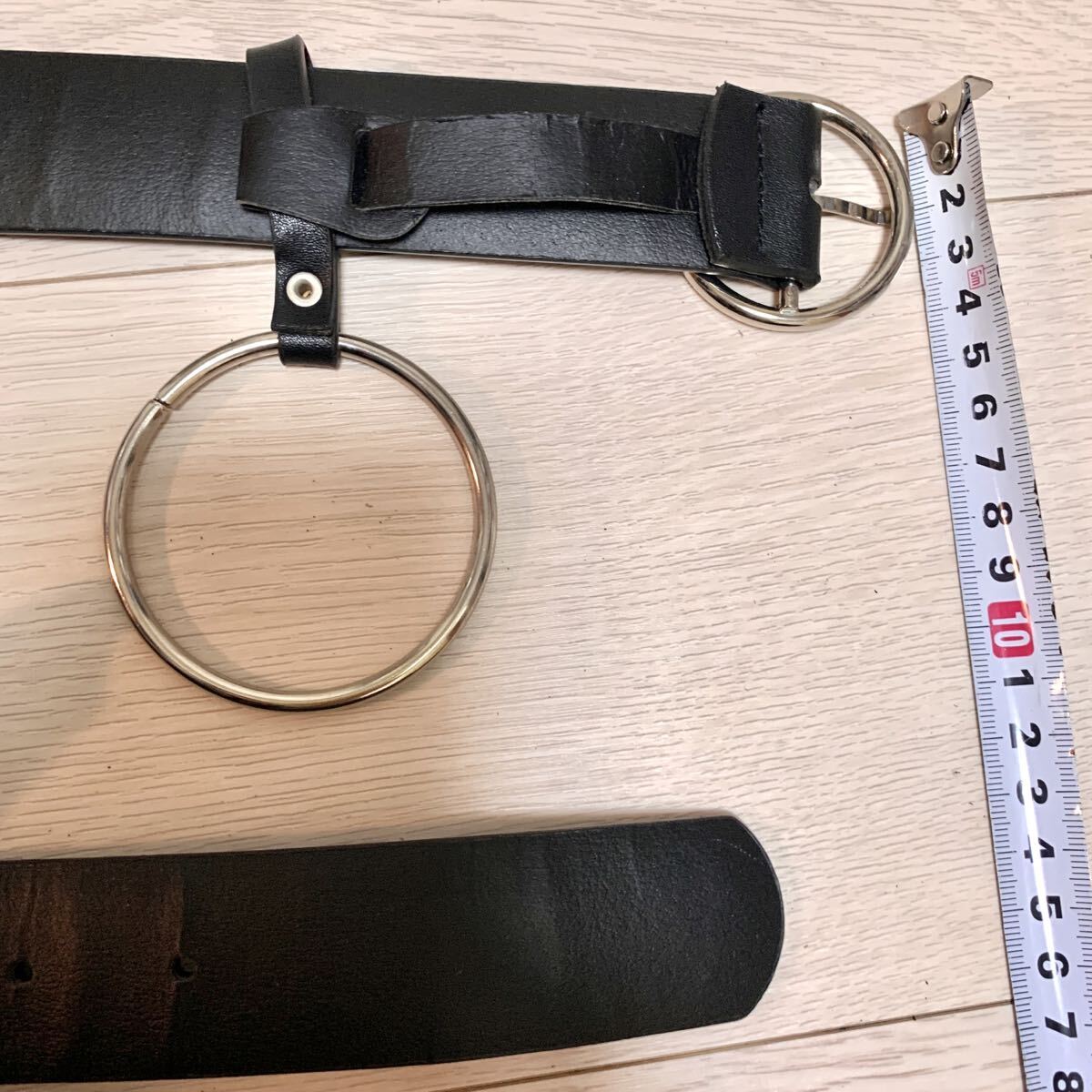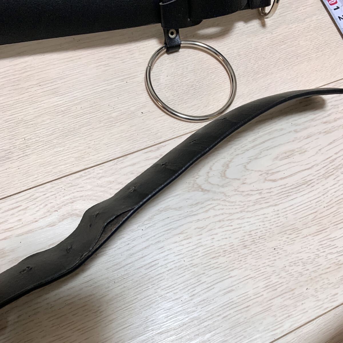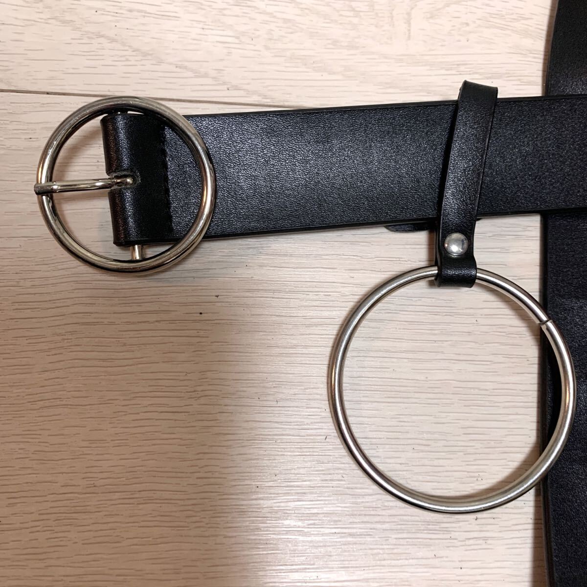 リング付きのブラックレザーベルト、調整可能でスタイリッシュ。