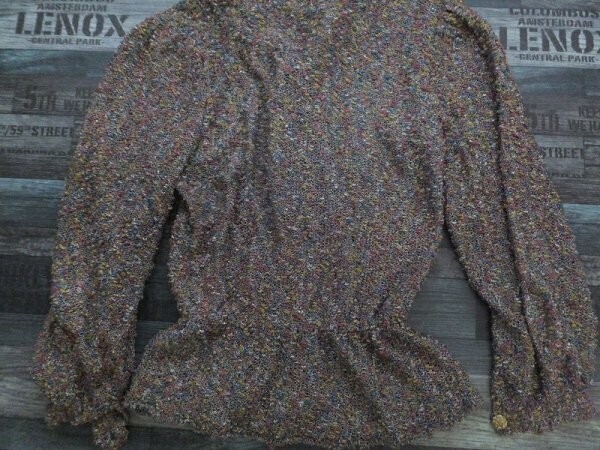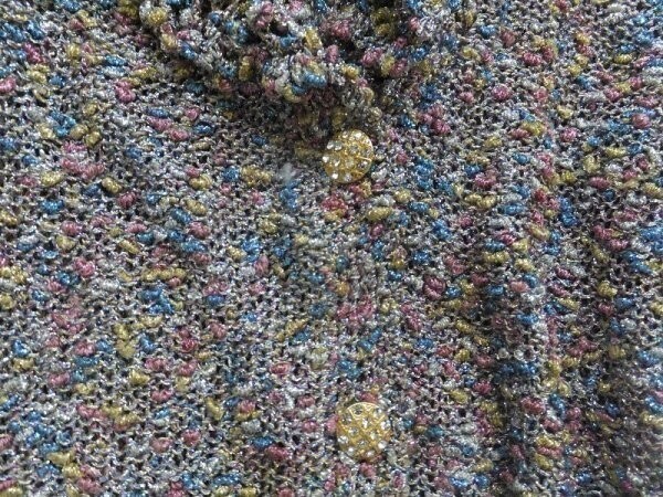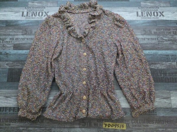 ノーブランド レディース 襟フリル ライトストーン キラキラボタン シャリシャリ ニットカーディガン 銀赤青他 です。