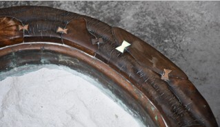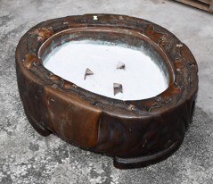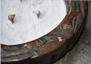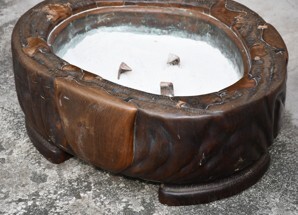 ◆旧家よりのウブ出しです◆埋木象嵌火鉢 約75×66×H28cm 内銅板 綺麗な灰 鉄製五徳付◆天然木 刳貫◆囲炉裏 鉄瓶 瓶掛 天板縁幅9~10cm
