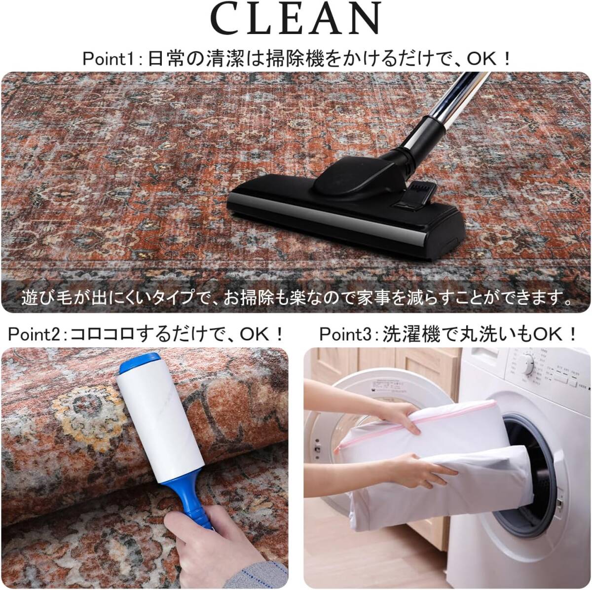 密度が高くて短めの毛足はゴミが絡みにくく、日常の清潔は掃除機をかけるだけで、OK!汚れた場合は手洗いや洗濯ネットに入れて洗濯機で洗うことができます。※ラグは風通しの良いところで陰干しして、アイロン、乾燥機はご使用をお避け下さい。