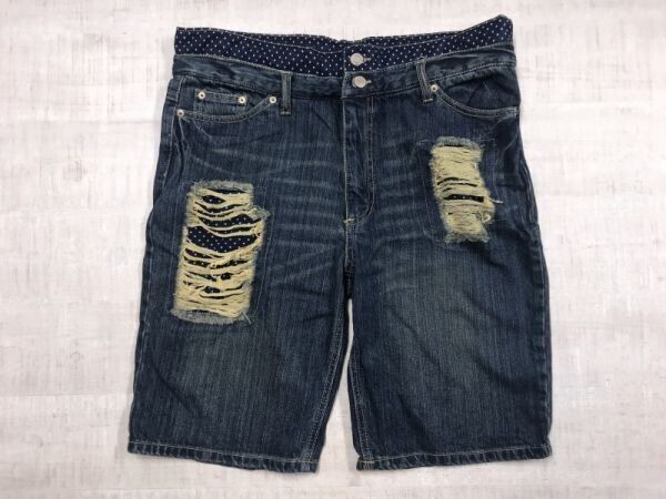 Y2K 00s ネオグランジ 古着 ダメージ加工 ジップフライ ダブルウエスト ハーフ ショート デニムパンツ ボトムス メンズ コットン100% 紺 です。