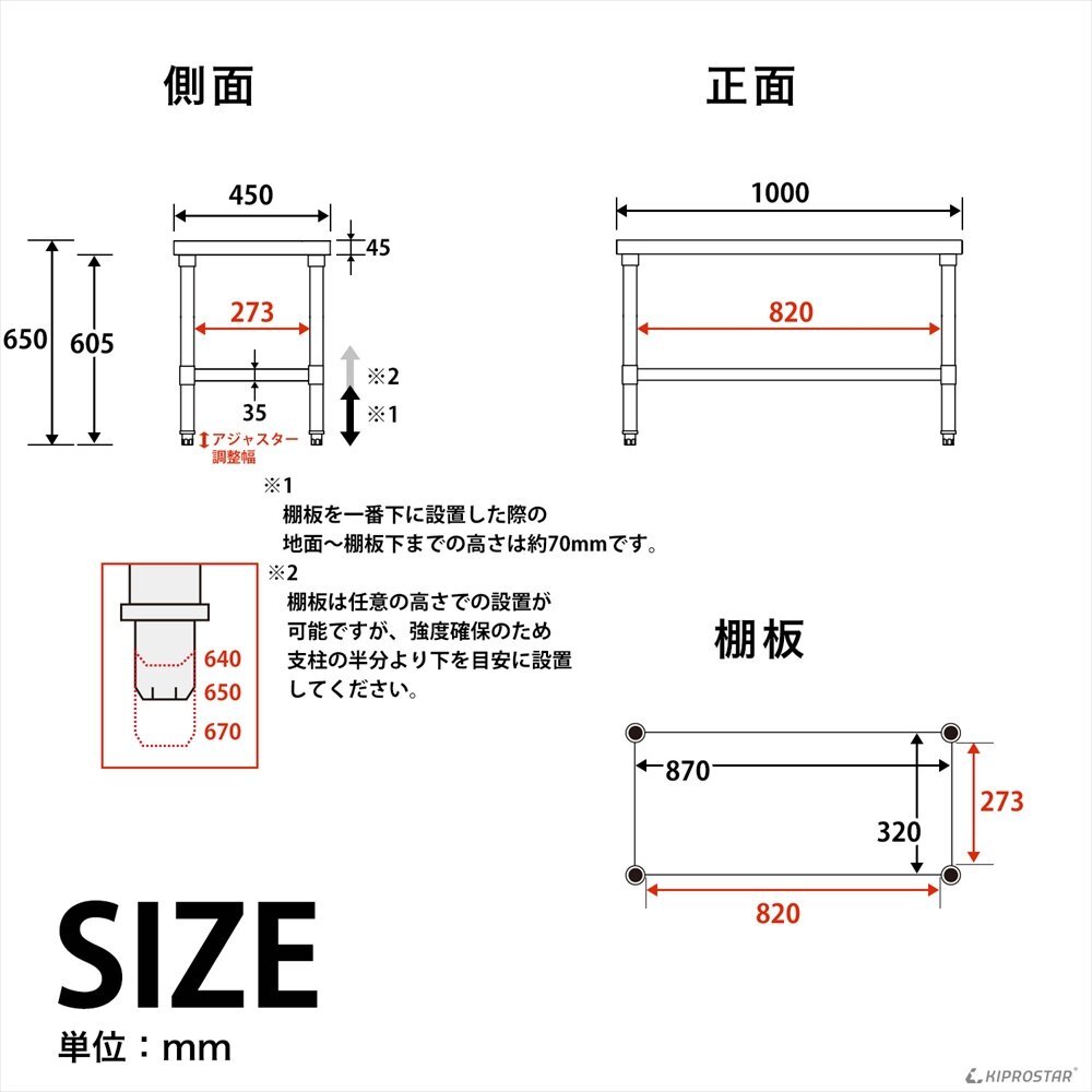 | 材質 | 天板:ステンレスSUS430 脚:ステンレスSUS201 梁:スチール アジャスト脚:ステンレスSUS201/PVC |
