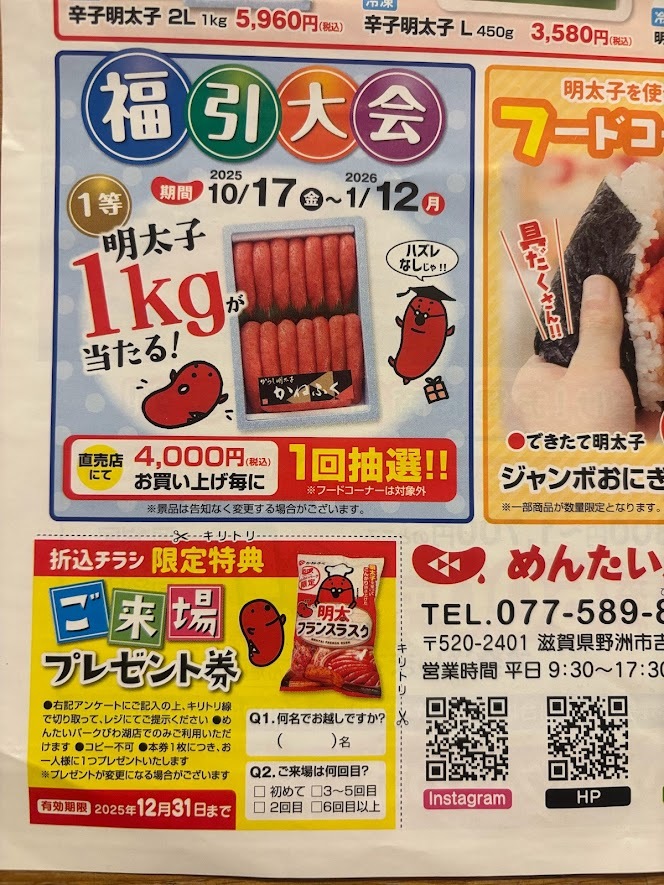 滋賀県 めんたいパーク びわ湖 ご来場プレゼント券 ※コピー不可 ※本券1枚につき、お一人様に1つプレゼントいたします。 ※プレゼントが変更になる場合がございます。 有効期限は12月31日まで | ||||||||