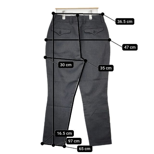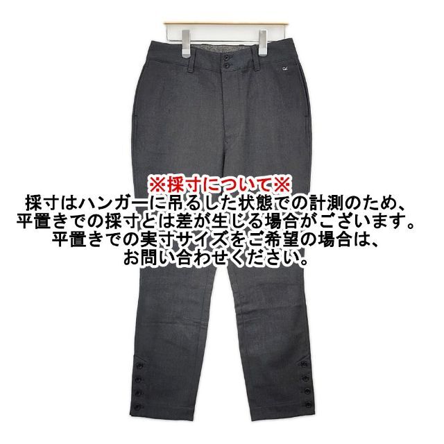 | 実寸サイズ | 総丈:約97cm ウエスト:約36.5cm 股上:約35cm 股下:約65cm ヒップ:約47cm ワタリ幅:約30cm 裾幅:約16.5cm ※採寸画像がある商品はハンガーに吊るした状態での計測のため、平置きでの採寸とは差が生じる場合がございます。平置きでの実寸サイズをご希望の場合は、ご購入前に必ずご質問ください。 ※記載以外のサイズが合わないことを理由とした返品はできませんので、 記載部分以外で実寸サイズの気になる箇所があれば必ず購入前にご質問ください。 |
