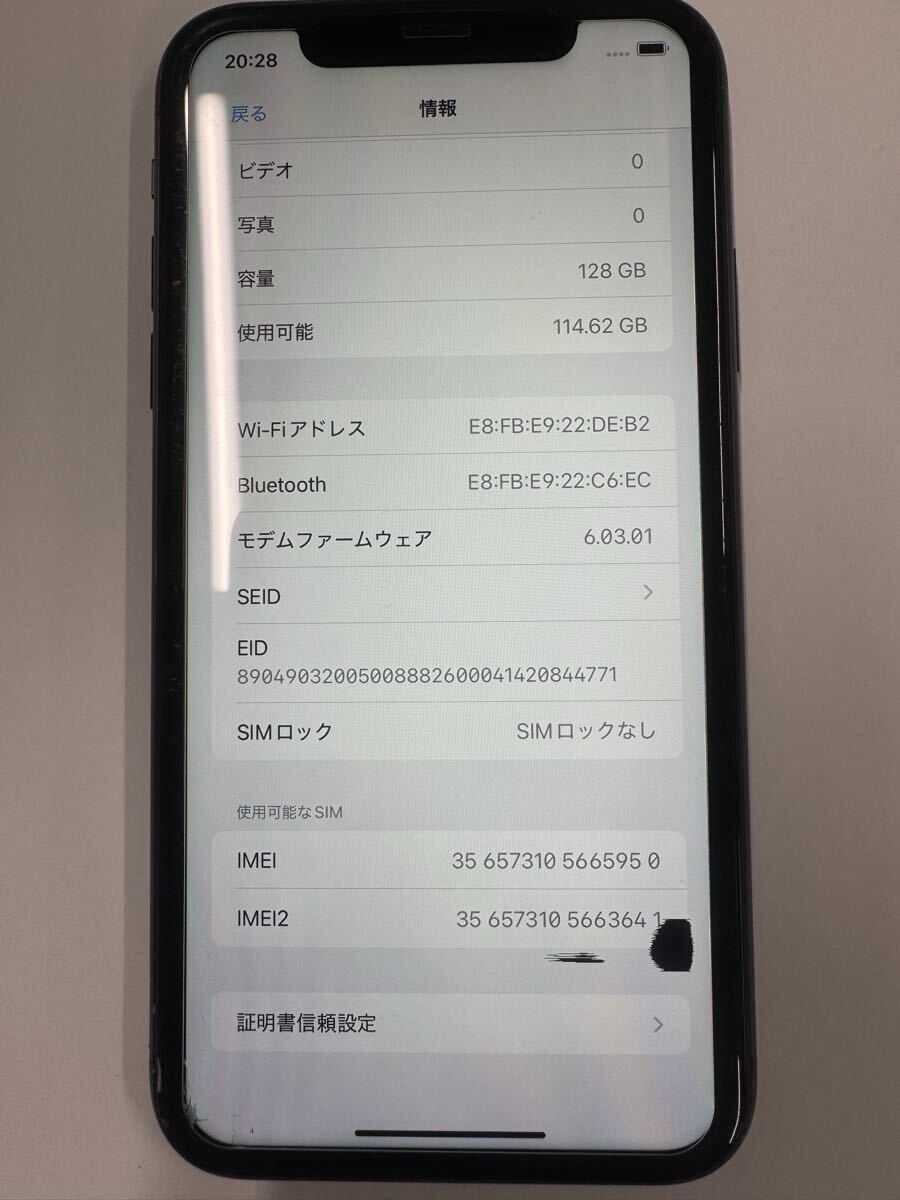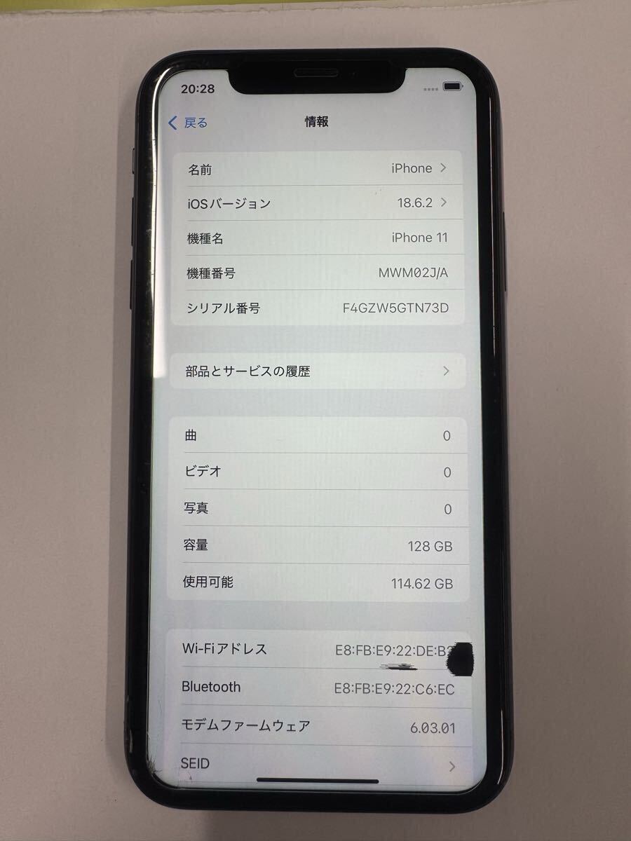 初期化済 iPhone 11 MWM32J/A 128G SIMフリー 表、傷あり 画面カバーシール付き