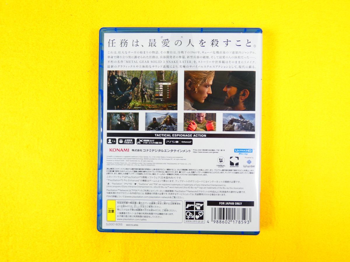 | 【 (AY-30) PlayStation5 プレイステーション5 PS5 ソフト 「 メタルギア ソリッド デルタ: スネークイーター 」ゲームソフト ※動作未確認@送料430円(10)】 ※基本的に金曜午後、土曜、日曜はオークションに関する連絡、発送等全般の対応は行っておりません。翌月曜日から順番になります。対応が遅れる場合が御座います。予め御了承下さい。 (金曜日終了日分の場合も翌月曜から対応です。) ※一番下の「ご注意事項」まで全てお読みになり、ご検討、ご入札をお願い致します。 ■状態:ジャンク品です。 動作未確認です。 ディスク:小傷、少々汚れがございます。 付属品:経年の汚れ、傷み等ございます。 あくまでも動作未確認の為品質・動作保証のないジャンク品をご理解の上ご検討宜しくお願い致します。 ※付属品に関しては画像にてご確認いただけるものが全てとなっております。 ※タイトル最後尾の()内は当方の番号です。 素人の目視確認の為、見落としがある場合もございます。 クリーニングはあくまでも簡易的なため、細かな汚れやホコリが付着した状態でお渡しする場合もございます。 ■元払い 発送予定サイズ レターパックライト全国一律430円 ※お支払いはかんたん決済のみになります。 ※同梱に関しましては同日終了日分(同梱可能サイズ160 / 23㎏迄)のみとさせて頂きます。 送料は同梱サイズにより変動致します。 ゆうパック取り扱い不可商品との同梱の場合は佐川急便での配送となります。 ※配送業者、発送方法の変更は承れませんのでご了承願います。 ※下記の【ご注意事項】を御覧頂き、御了承、御理解の上御入札、御検討を御願い致します。 |