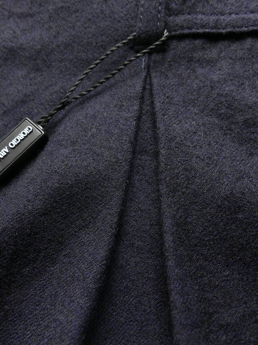 GAミラノランウェイに登場したコレクションピースの別生地モデル。皺加工が施された起毛フランネル生地で仕立てたボックスプリーツの濃紺テーパードパンツ。ウエストアジャスターとボックスプリーツがデザインポイント。腰回りディテールですのでタックイン前提になる感じです。皺加工が全体に表情をプラス。ベーシックな濃紺テーパードですが見どころディテールの多いパンツです。目の詰まった密織りフランネル生地でふっくら起毛質感。着用シーズンは11月から3月になります。なかなかに暖かいパンツで1月2月はヘビーローテーションになるでしょう。