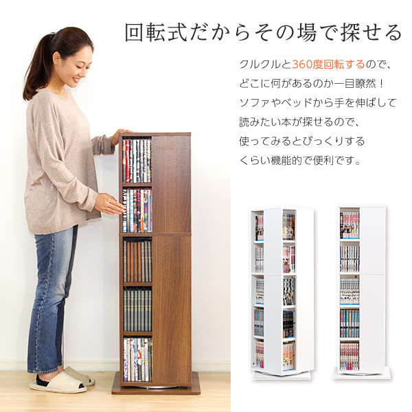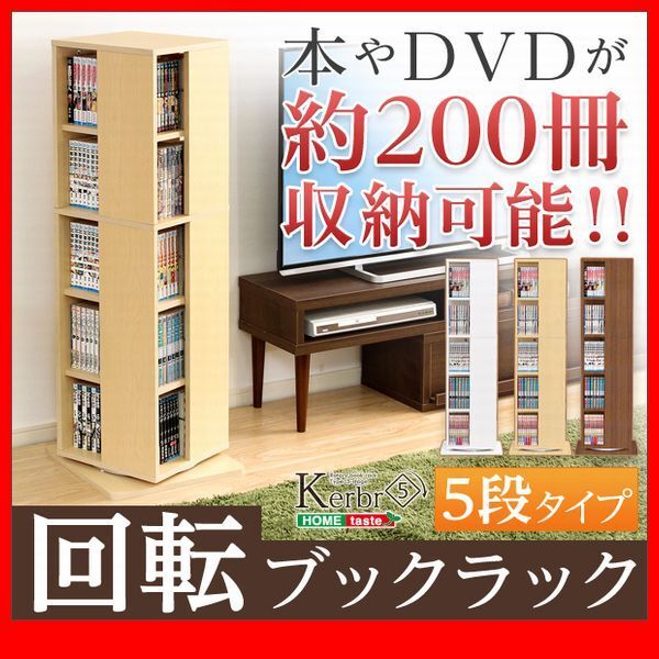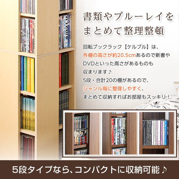 【ポイント】 くるくる回る回転式なので探しやすい! コンパクト設計だから省スペースにおけます。 本やDVDが約200冊収納できる大容量です。 カラーはインテリアに馴染む3色がございます。 |