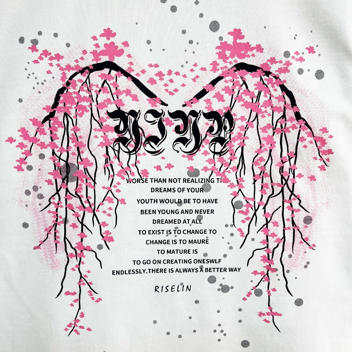 フロントはあえて装飾を控えた無地のミニマルデザインで、どんなスタイルにもすっとなじむ万能さが魅力。対してバックスタイルには、アーティスティックなウィングモチーフを大胆にプリント。シンプルさと個性を両立させた、他にはない存在感のある仕上がりです。