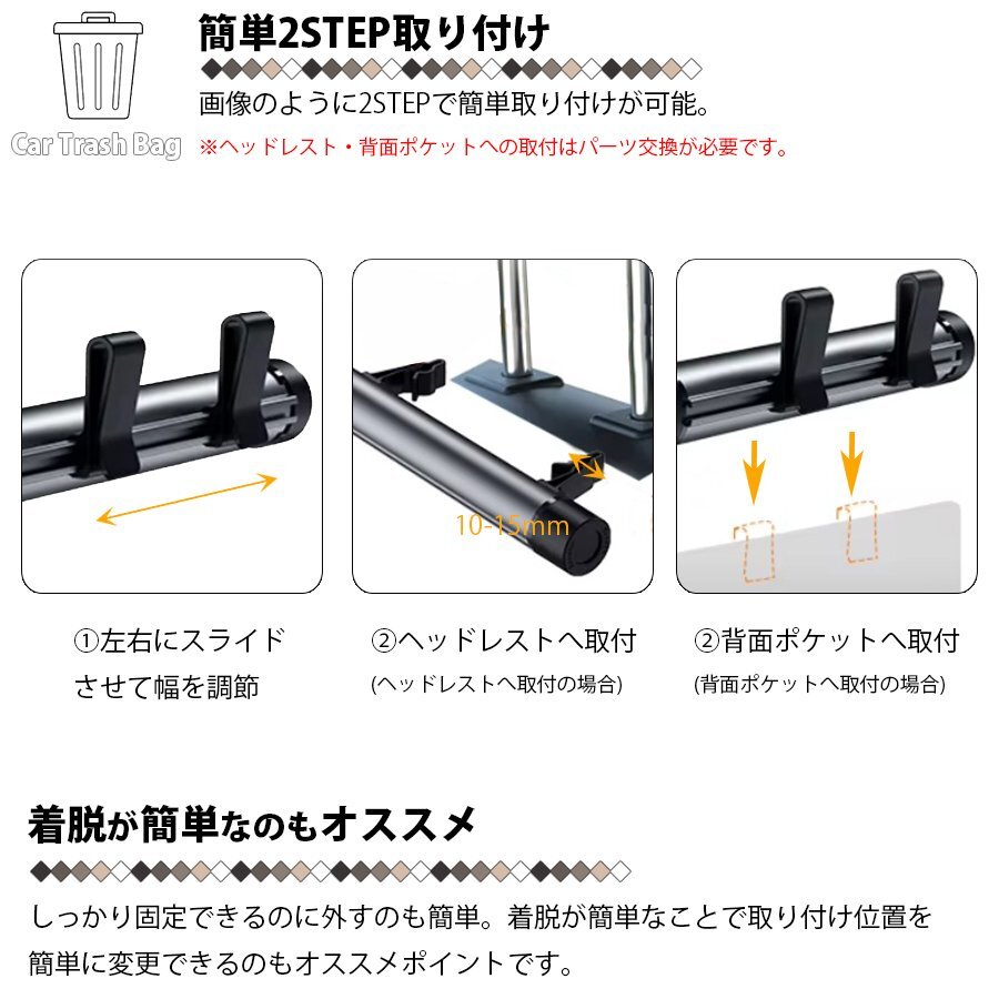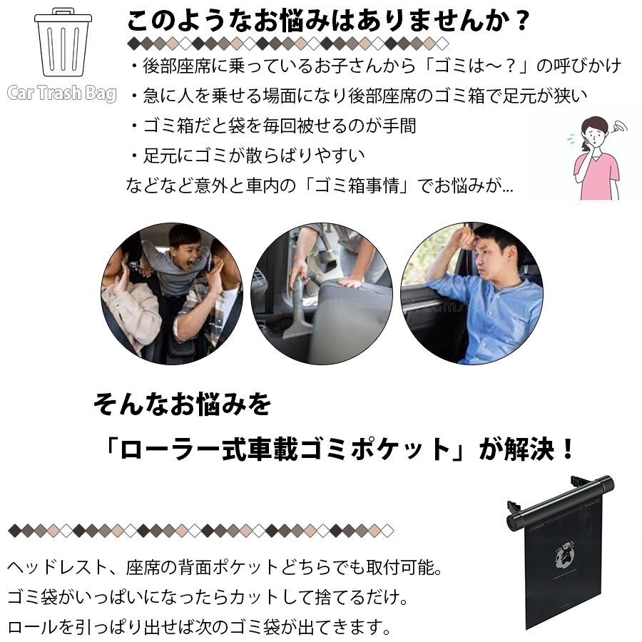 | ・後部座席の足元がスッキリして省スペース ・ヘッドレストとシートポケットへの取付用パーツ2種が標準付属 ・ゴミ袋は厚手のPE材質で破れにくく漏れにくい ・ローラー式で袋がいっぱいになるとミシン目でちぎって新しい袋を引っ張り出すだけ |