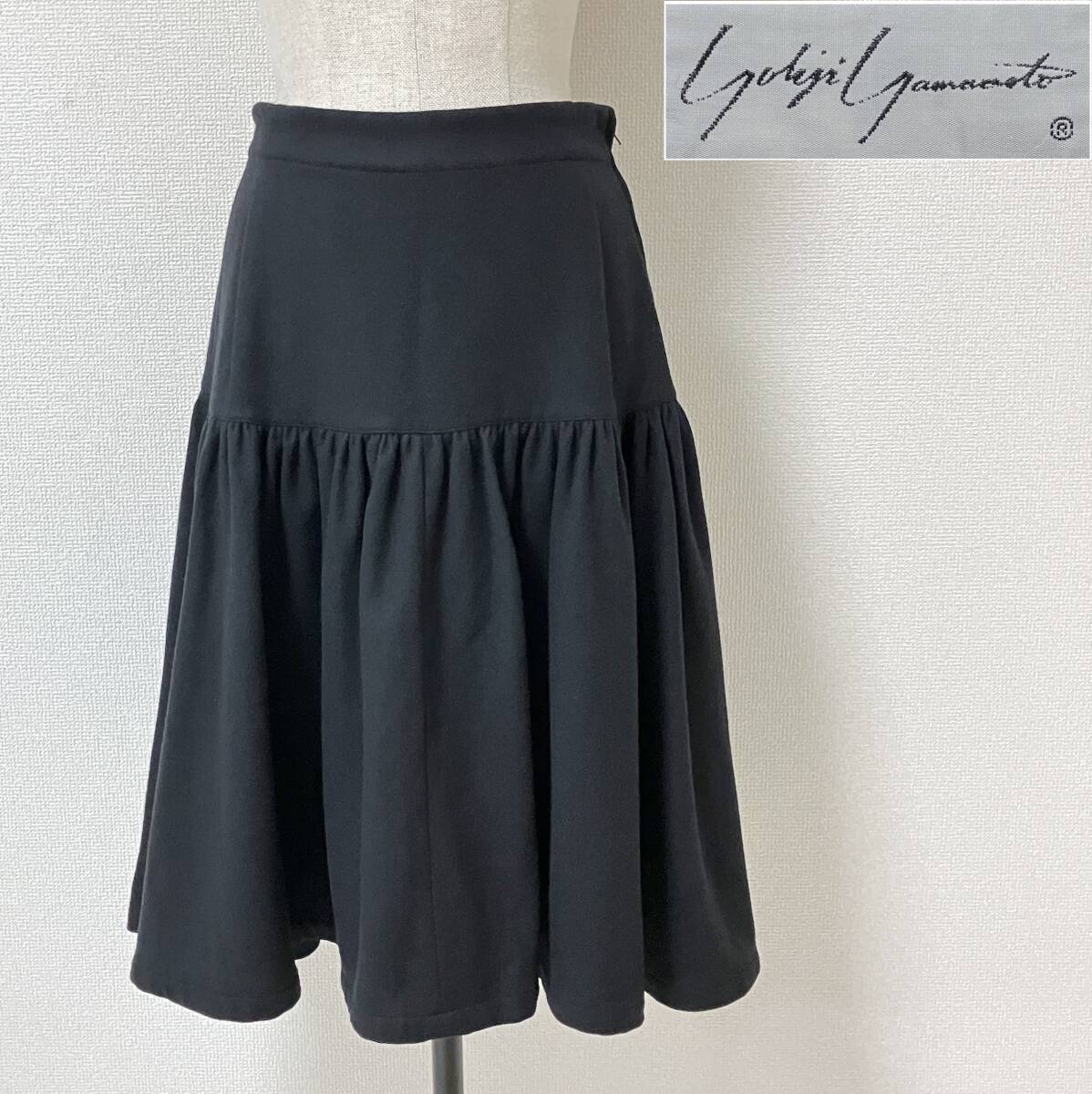 80s 丸文字タグ Yohji Yamamoto Femme ウール フレア ティアード スカート ブラック