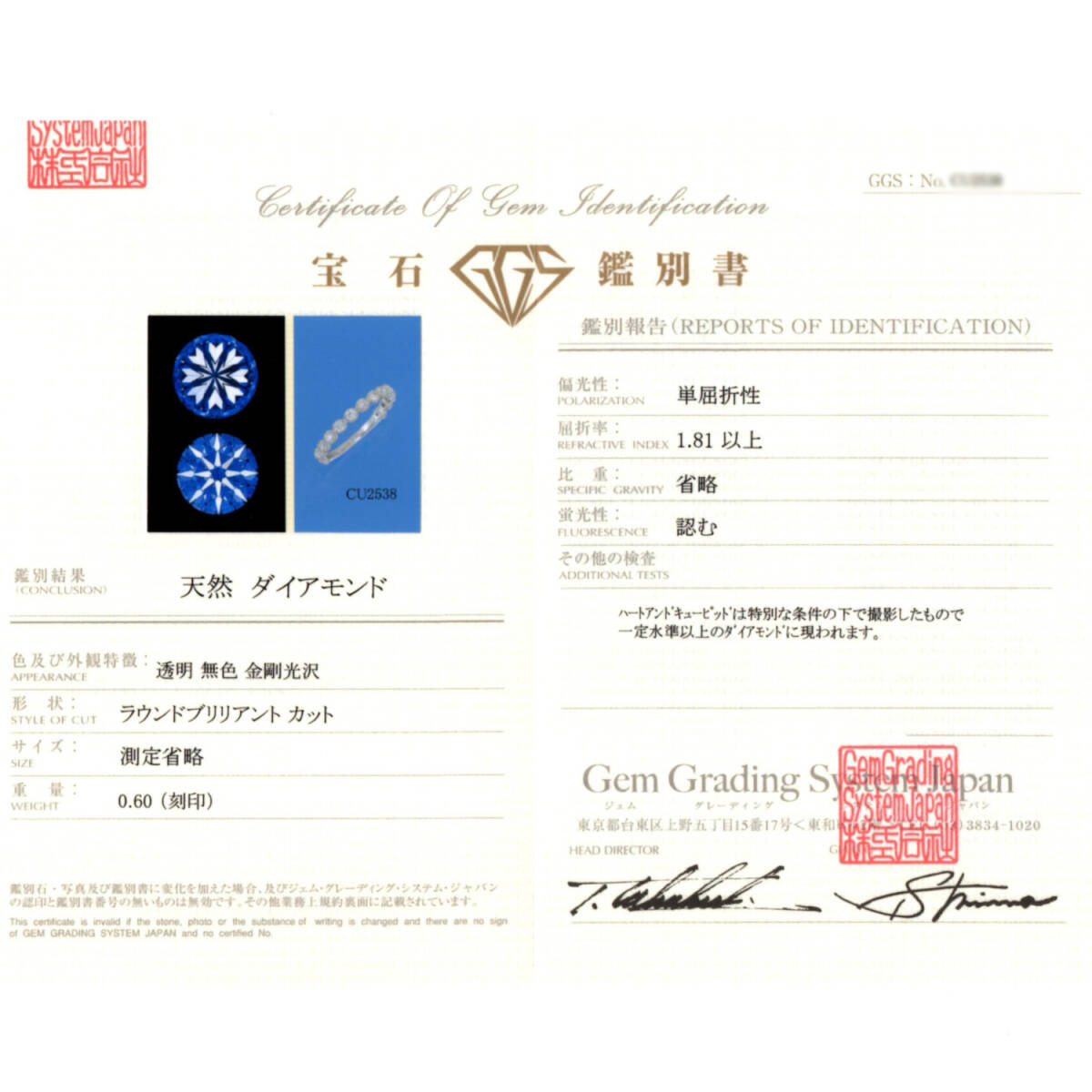 鑑別書に色の記載欄そのものが無い場合がございますので、ご注意くださいませ。