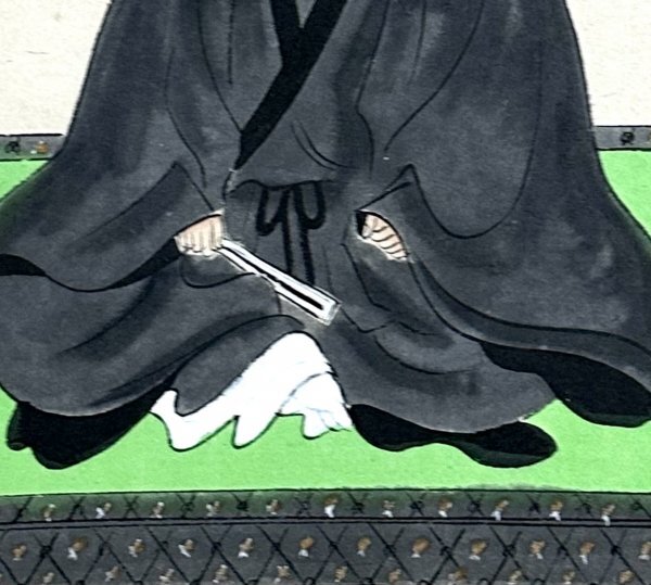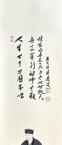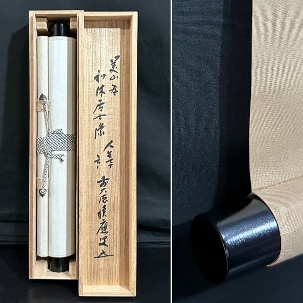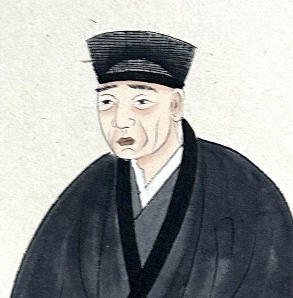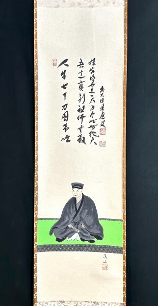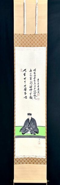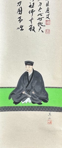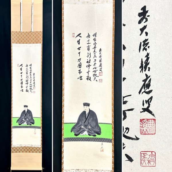 H16H11【真作】福本積應 賛 美山 画「利休居士像」掛軸 紙本 肉筆 書 人物画 臨済宗 大徳寺派 招春寺住職 茶道具 茶掛 共箱