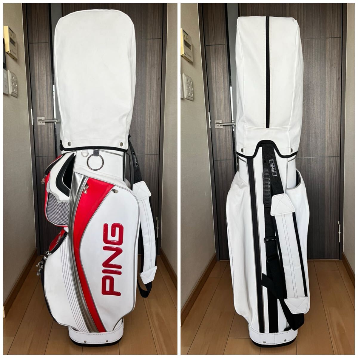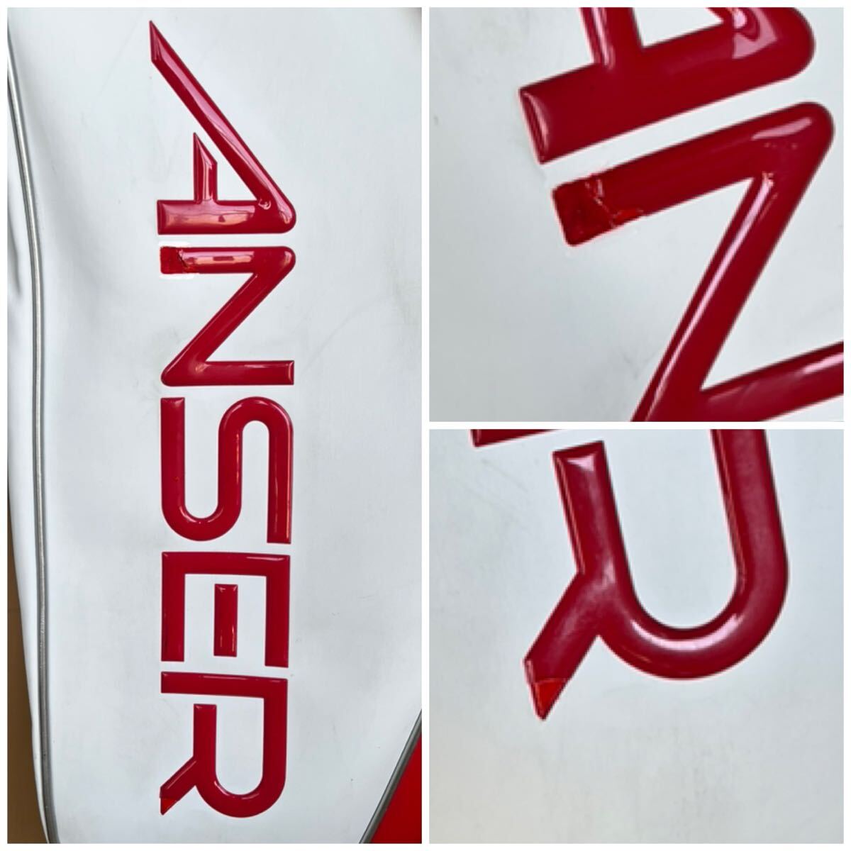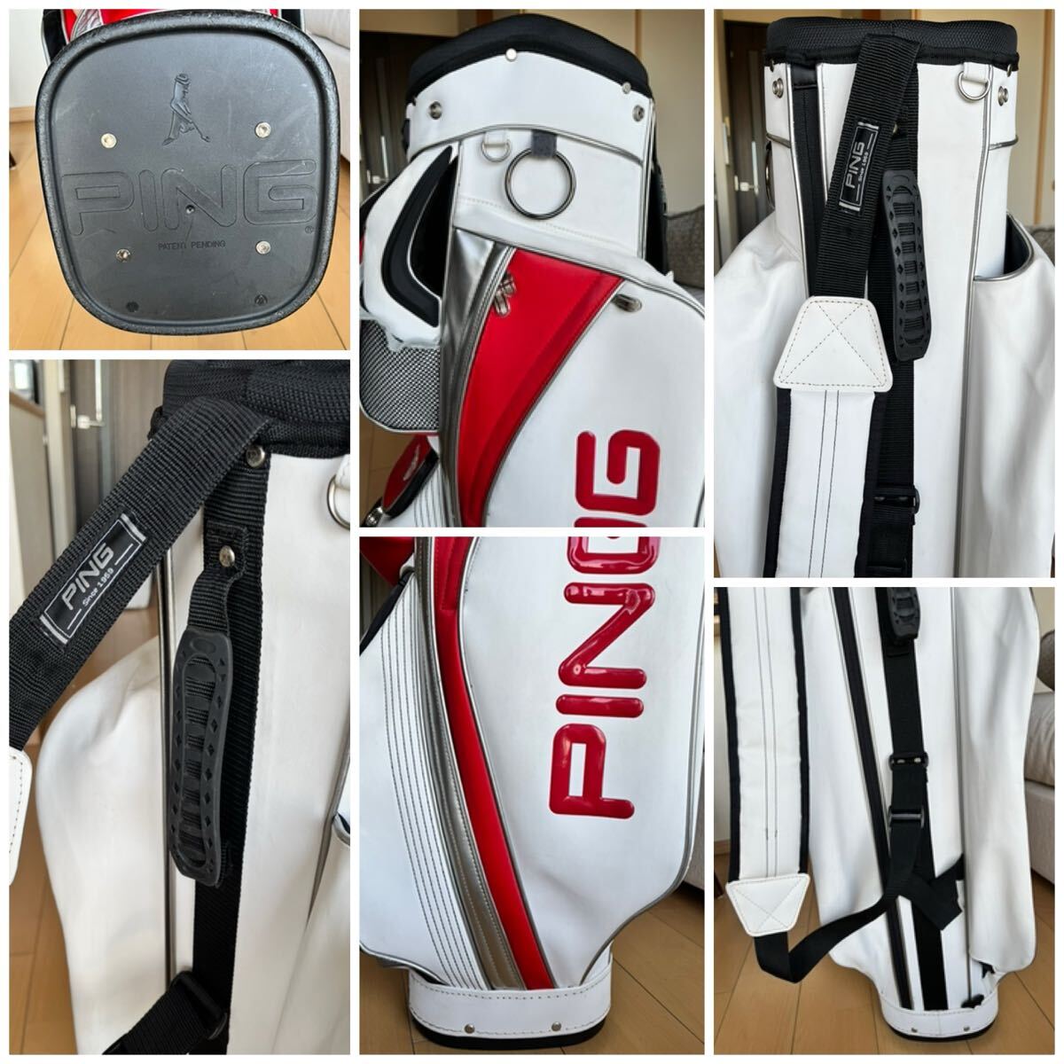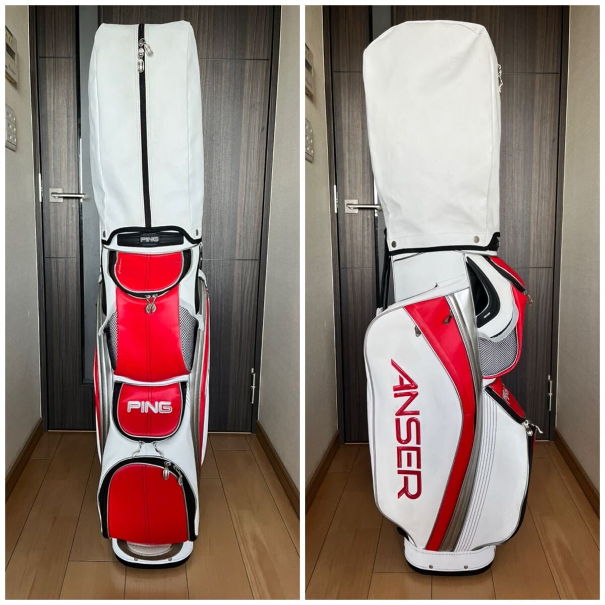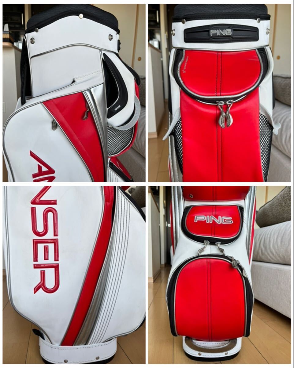 PING ANSER アンサー カートキャディバッグ、ホワイトとレッドの合成皮革製で多機能ポケット付き。